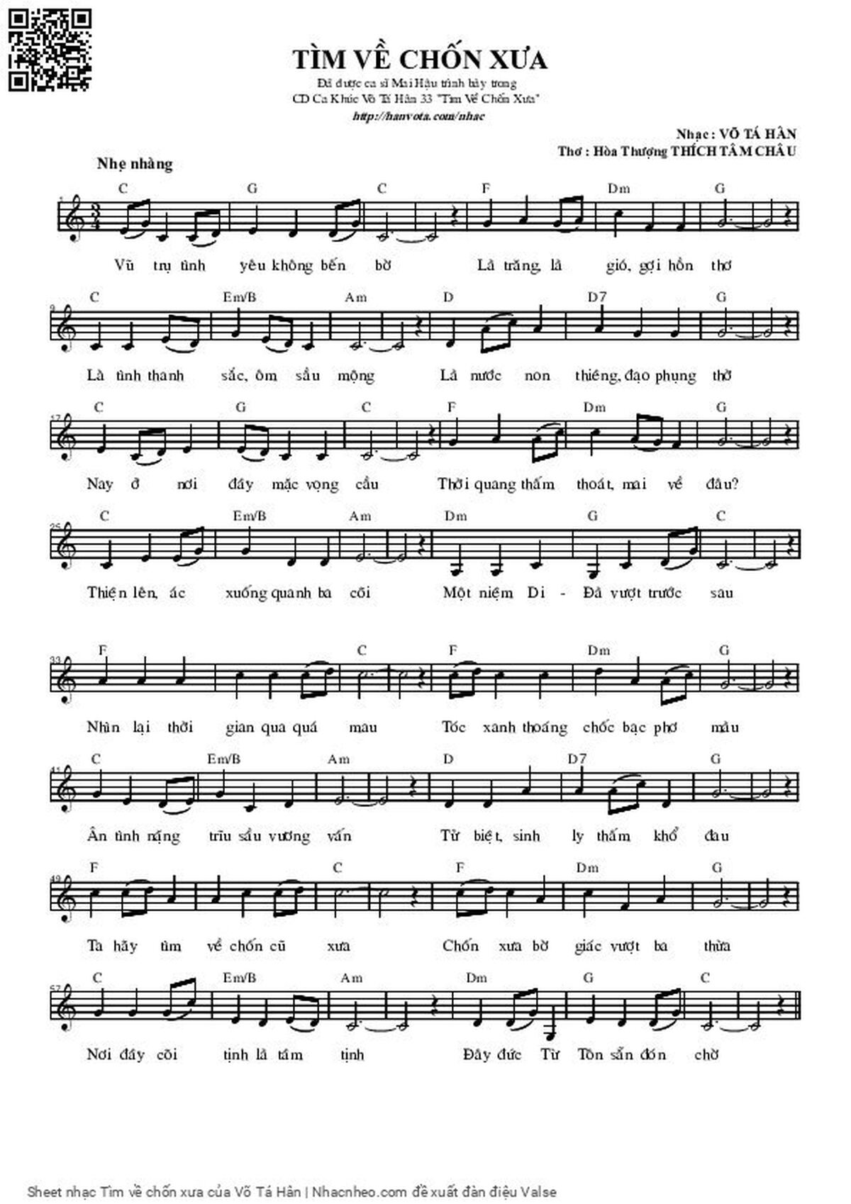 Phần nghe hát Tìm về chốn xưa (Võ Tá Hân) được nhúng từ Youtube, Musescore hoặc link ngoài và chịu sự kiểm soát bản quyền của bên thứ ba đó, vì vậy có thể bị xóa hoặc chèn quảng cáo bất kỳ lúc nào. Nếu bạn không nghe - xem được ca sĩ hát tức là đã bị Youtube hoặc Musescore kiểm soát.