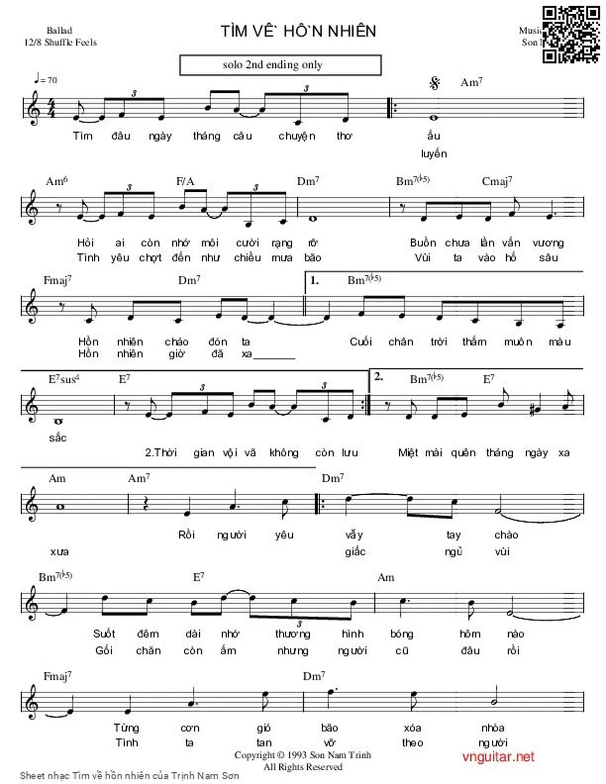 Phần nghe hát Tìm về hồn nhiên (Trịnh Nam Sơn) được nhúng từ Youtube, Musescore hoặc link ngoài và chịu sự kiểm soát bản quyền của bên thứ ba đó, vì vậy có thể bị xóa hoặc chèn quảng cáo bất kỳ lúc nào. Nếu bạn không nghe - xem được ca sĩ hát tức là đã bị Youtube hoặc Musescore kiểm soát.
