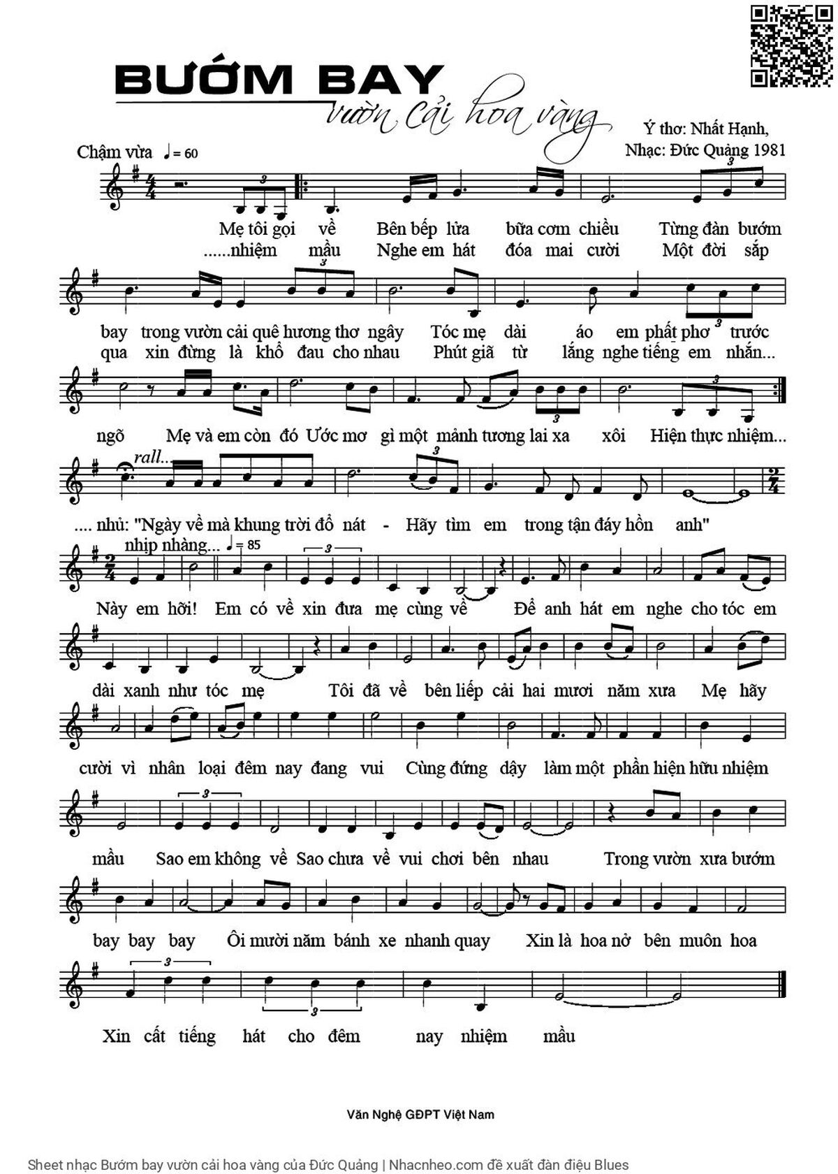 Chọn nút dấu + để tăng tông lên nửa cung, nút dấu - để giảm tông xuống nửa cung. Rê chuột vào hợp âm để xem các thế bấm hợp âm của bài hát Bướm bay vườn cải hoa vàng.