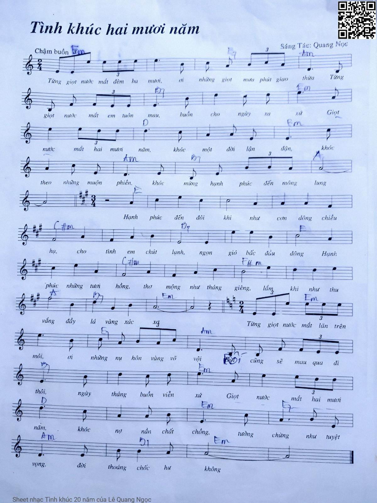 Phần nghe hát Tình khúc 20 năm (Lê Quang Ngọc) được nhúng từ Youtube, Musescore hoặc link ngoài và chịu sự kiểm soát bản quyền của bên thứ ba đó, vì vậy có thể bị xóa hoặc chèn quảng cáo bất kỳ lúc nào. Nếu bạn không nghe - xem được ca sĩ hát tức là đã bị Youtube hoặc Musescore kiểm soát.