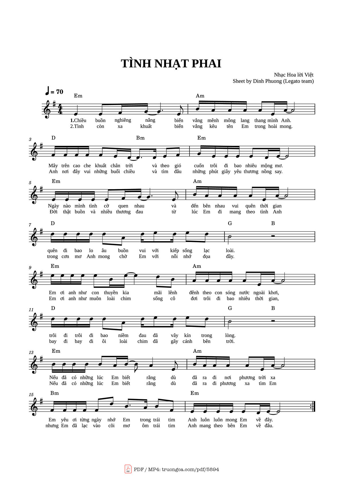 Chọn nút dấu + để tăng tông lên nửa cung, nút dấu - để giảm tông xuống nửa cung. Rê chuột vào hợp âm để xem các thế bấm hợp âm của bài hát Tình nhạt phai.