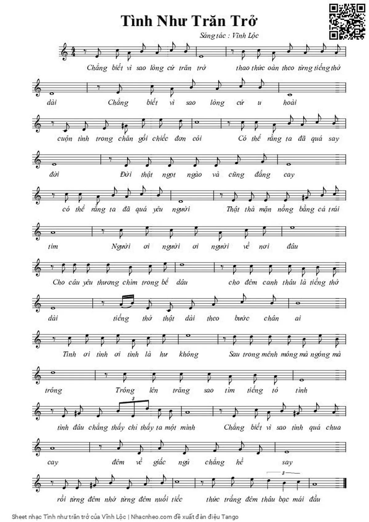 Vĩnh Lộc Chẳng biết vì sao lòng cứ trăn trở Thao thức oằn theo từng tiếng thở dài [PDF] [Sheet] [Lời H.A] [Mp4/Midi]