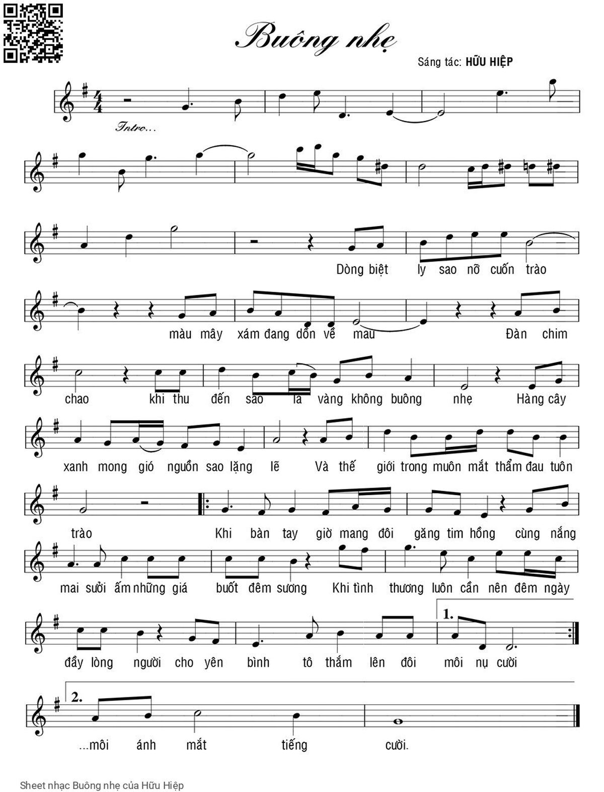 Phần nghe hát Buông nhẹ (Hữu Hiệp) được nhúng từ Youtube, Musescore hoặc link ngoài và chịu sự kiểm soát bản quyền của bên thứ ba đó, vì vậy có thể bị xóa hoặc chèn quảng cáo bất kỳ lúc nào. Nếu bạn không nghe - xem được ca sĩ hát tức là đã bị Youtube hoặc Musescore kiểm soát.
