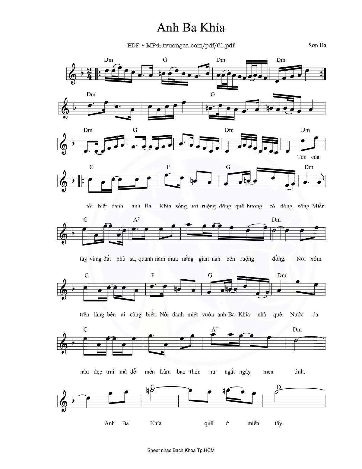 Sơn Hạ Tên của tôi biệt danh anh ba khía Sống nơi ruộng đồng quê hương có dòng sông [PDF] [Sheet] [Lời H.A] [Mp4/Midi]