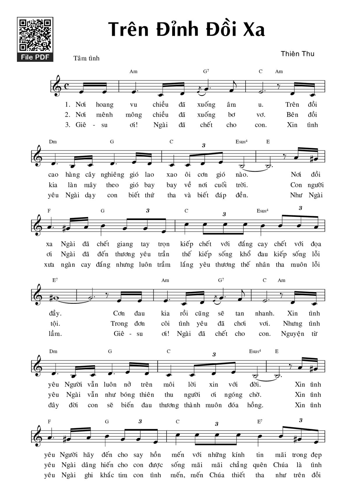 Phần nghe hát Trên đỉnh đồi xa (Thiên Thu) được nhúng từ Youtube, Musescore hoặc link ngoài và chịu sự kiểm soát bản quyền của bên thứ ba đó, vì vậy có thể bị xóa hoặc chèn quảng cáo bất kỳ lúc nào. Nếu bạn không nghe - xem được ca sĩ hát tức là đã bị Youtube hoặc Musescore kiểm soát.