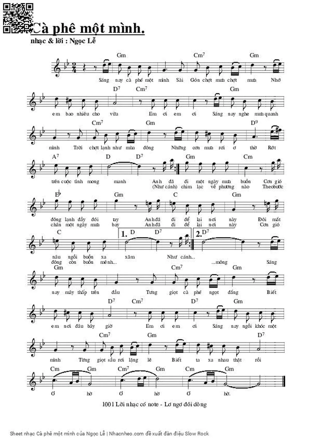 Chọn nút dấu + để tăng tông lên nửa cung, nút dấu - để giảm tông xuống nửa cung. Rê chuột vào hợp âm để xem các thế bấm hợp âm của bài hát Cà phê một mình.