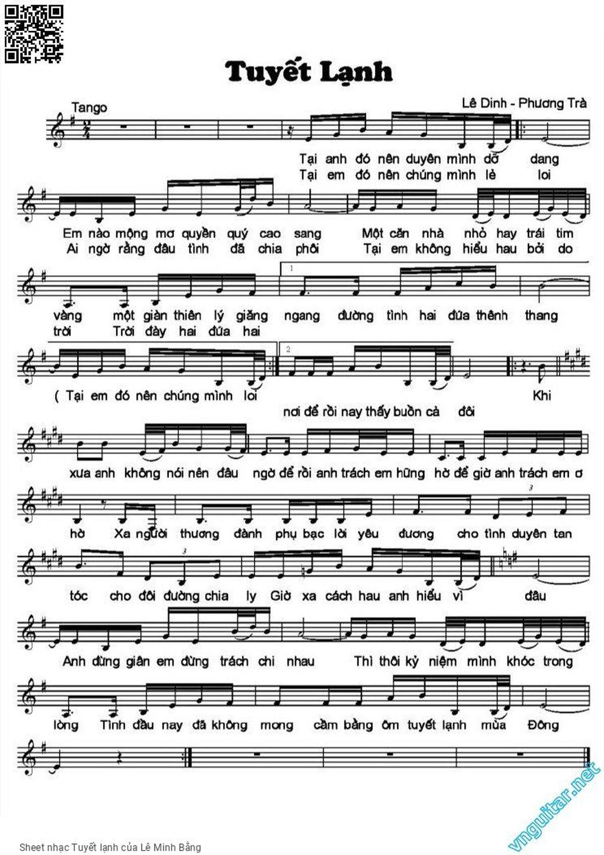 Chọn nút dấu + để tăng tông lên nửa cung, nút dấu - để giảm tông xuống nửa cung. Rê chuột vào hợp âm để xem các thế bấm hợp âm của bài hát Tuyết lạnh.