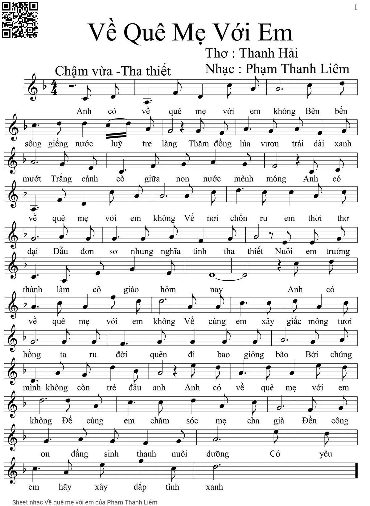 Phạm Thanh Liêm Anh có về quê mẹ với em không Bên bến sông giếng nước lũy tre làng [PDF] [Sheet] [Lời H.A] [Mp4/Midi]
