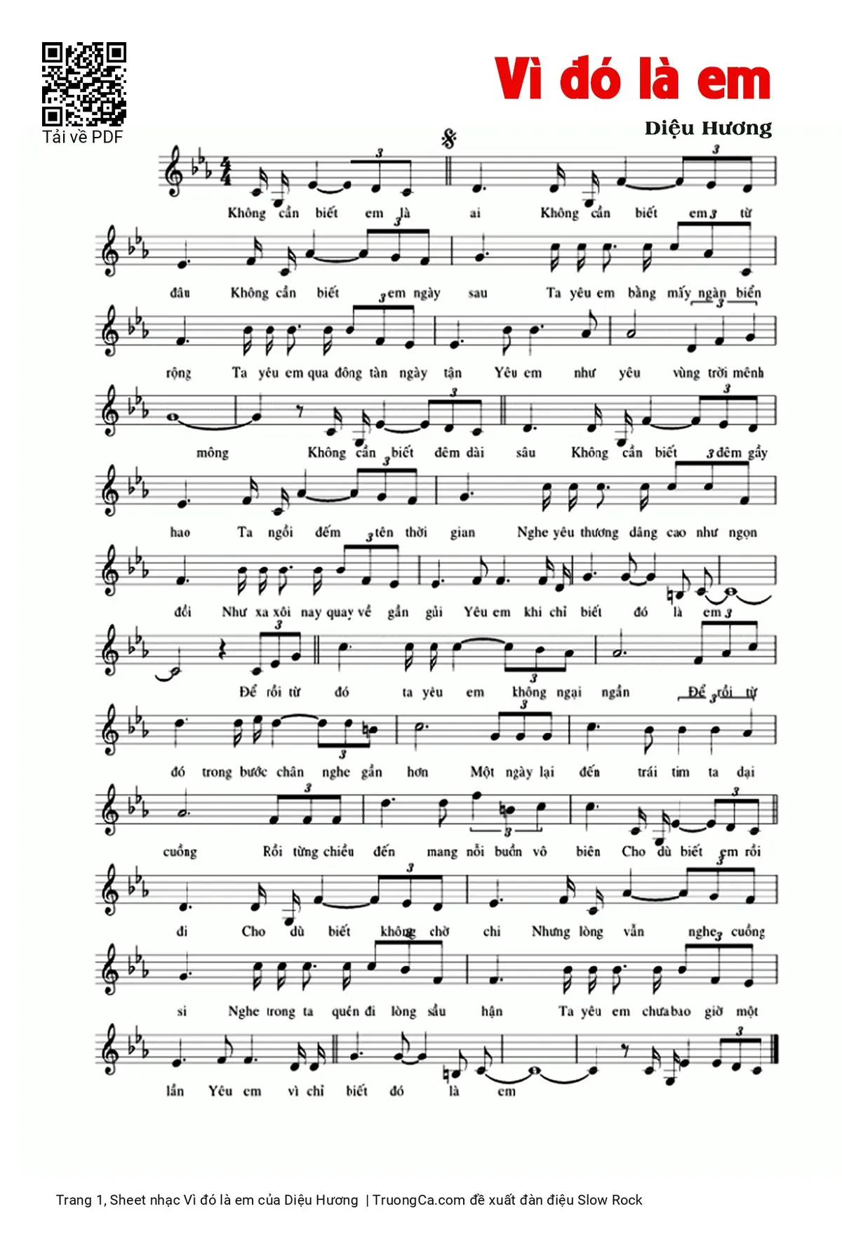 Phần nghe hát Vì đó là em (Diệu Hương) được nhúng từ Youtube, Musescore hoặc link ngoài và chịu sự kiểm soát bản quyền của bên thứ ba đó, vì vậy có thể bị xóa hoặc chèn quảng cáo bất kỳ lúc nào. Nếu bạn không nghe - xem được ca sĩ hát tức là đã bị Youtube hoặc Musescore kiểm soát.
