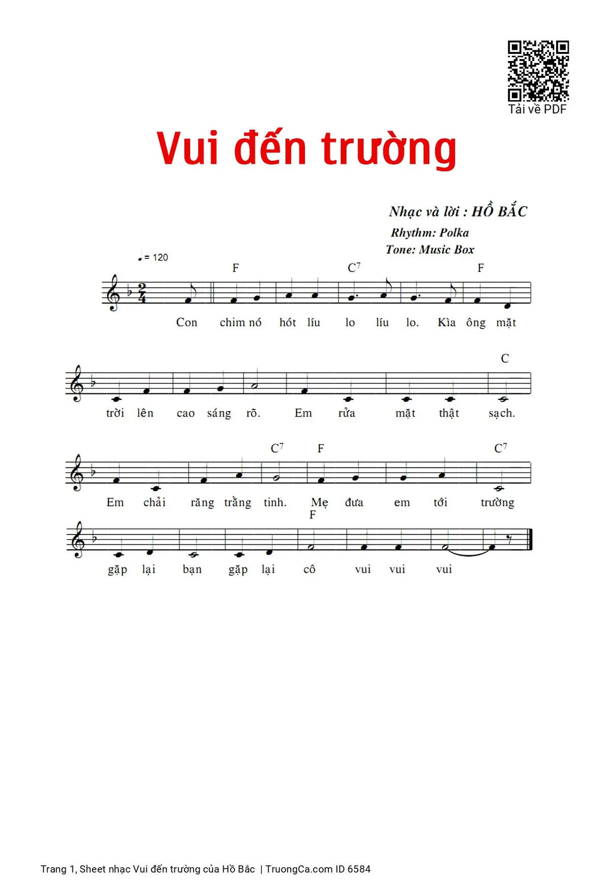 Chọn nút dấu + để tăng tông lên nửa cung, nút dấu - để giảm tông xuống nửa cung. Rê chuột vào hợp âm để xem các thế bấm hợp âm của bài hát Vui đến trường.