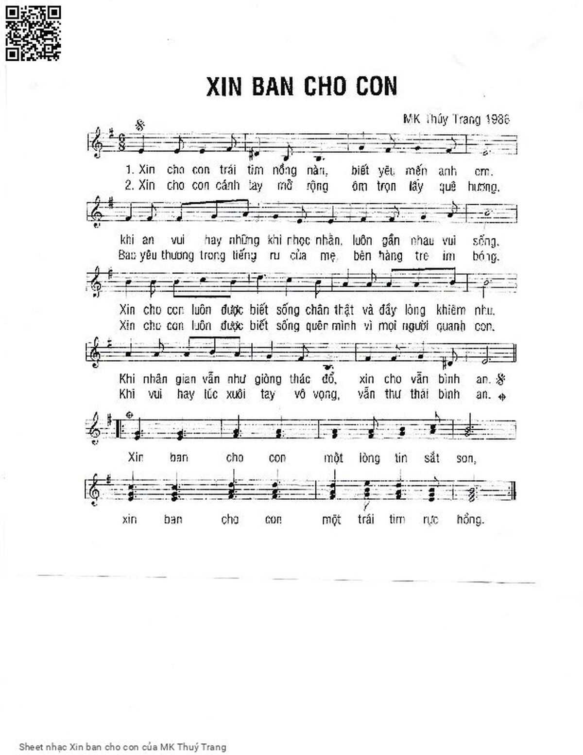 Phần nghe hát Xin ban cho con (MK Thuý Trang) được nhúng từ Youtube, Musescore hoặc link ngoài và chịu sự kiểm soát bản quyền của bên thứ ba đó, vì vậy có thể bị xóa hoặc chèn quảng cáo bất kỳ lúc nào. Nếu bạn không nghe - xem được ca sĩ hát tức là đã bị Youtube hoặc Musescore kiểm soát.