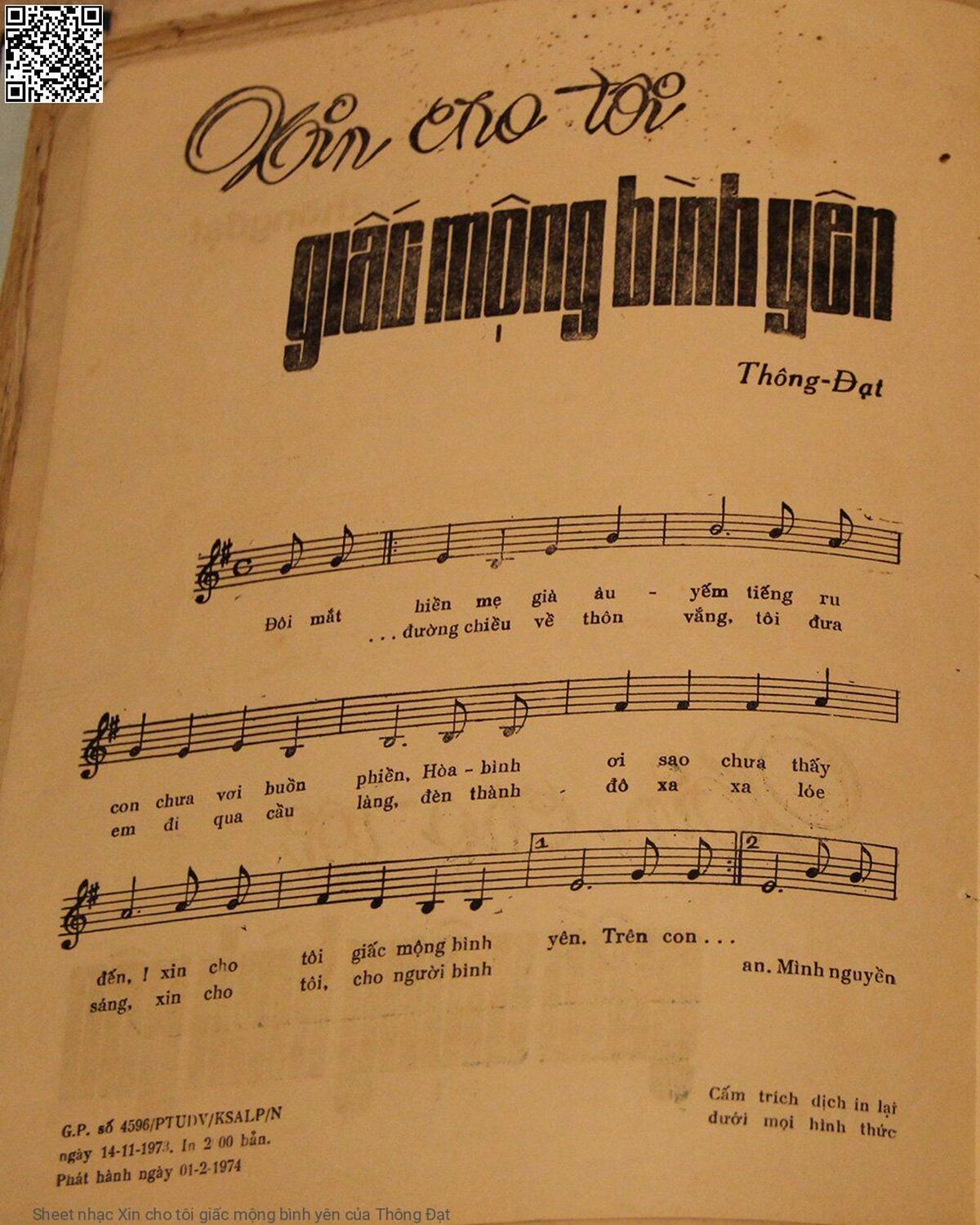 Phần nghe hát Xin cho tôi giấc mộng bình yên (Thông Đạt) được nhúng từ Youtube, Musescore hoặc link ngoài và chịu sự kiểm soát bản quyền của bên thứ ba đó, vì vậy có thể bị xóa hoặc chèn quảng cáo bất kỳ lúc nào. Nếu bạn không nghe - xem được ca sĩ hát tức là đã bị Youtube hoặc Musescore kiểm soát.