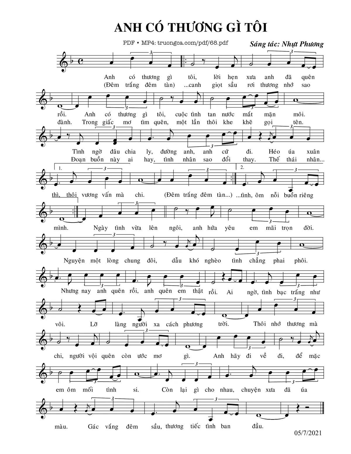 Nhựt Phương Anh có thương gì tôi [PDF] [Sheet] [Lời H.A] [Mp4/Midi]