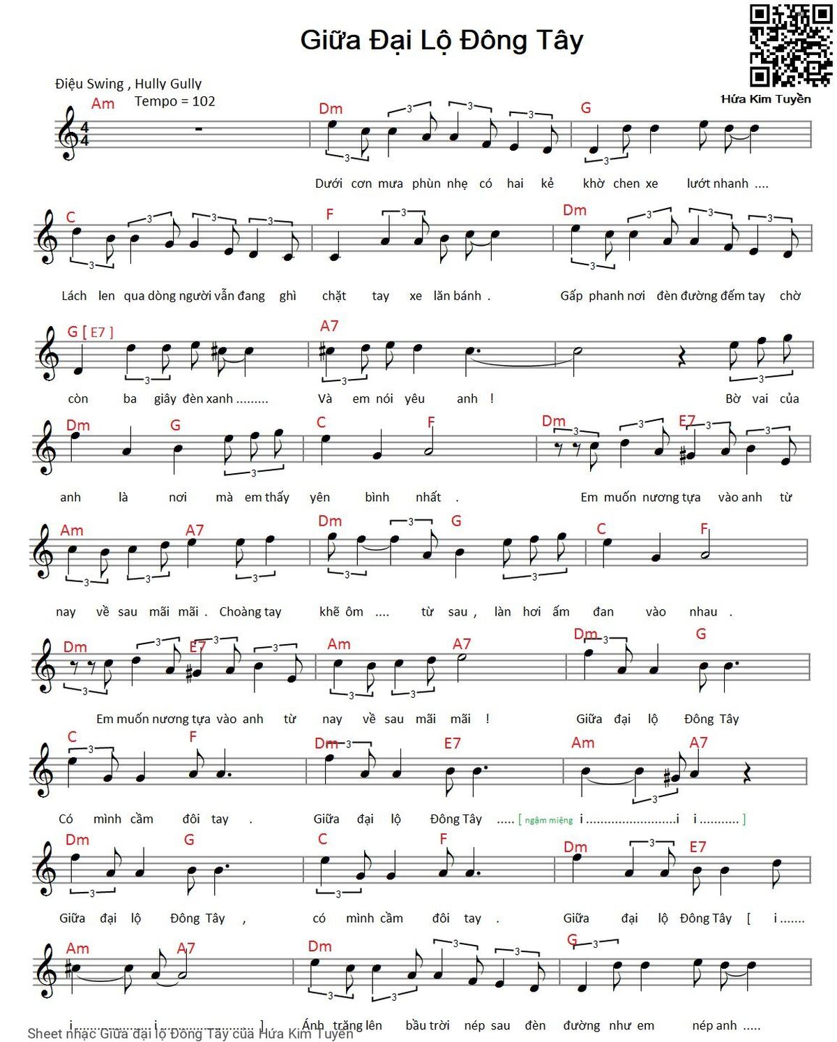 Chọn nút dấu + để tăng tông lên nửa cung, nút dấu - để giảm tông xuống nửa cung. Rê chuột vào hợp âm để xem các thế bấm hợp âm của bài hát Giữa đại lộ Đông Tây.