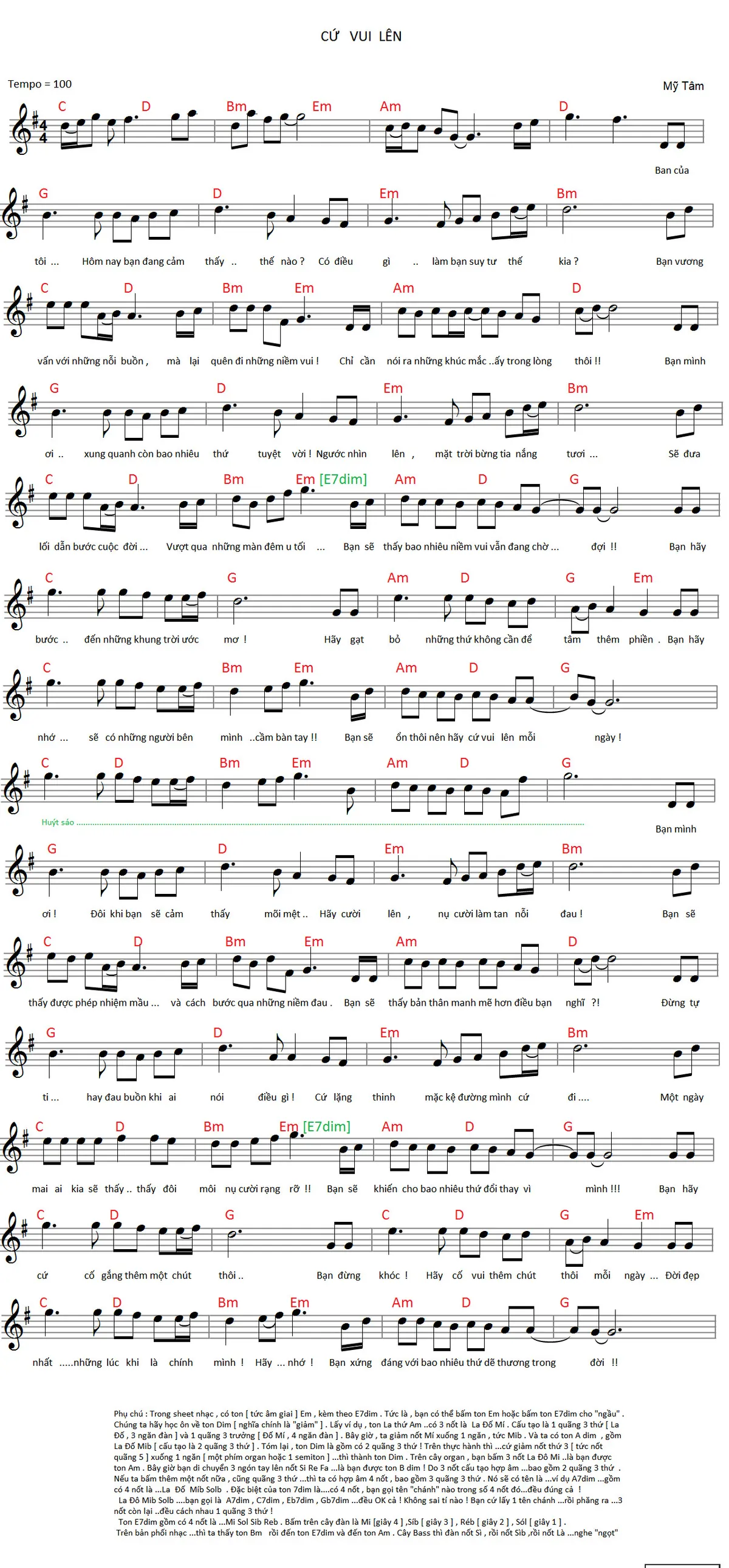 Chọn nút dấu + để tăng tông lên nửa cung, nút dấu - để giảm tông xuống nửa cung. Rê chuột vào hợp âm để xem các thế bấm hợp âm của bài hát Cứ vui lên.