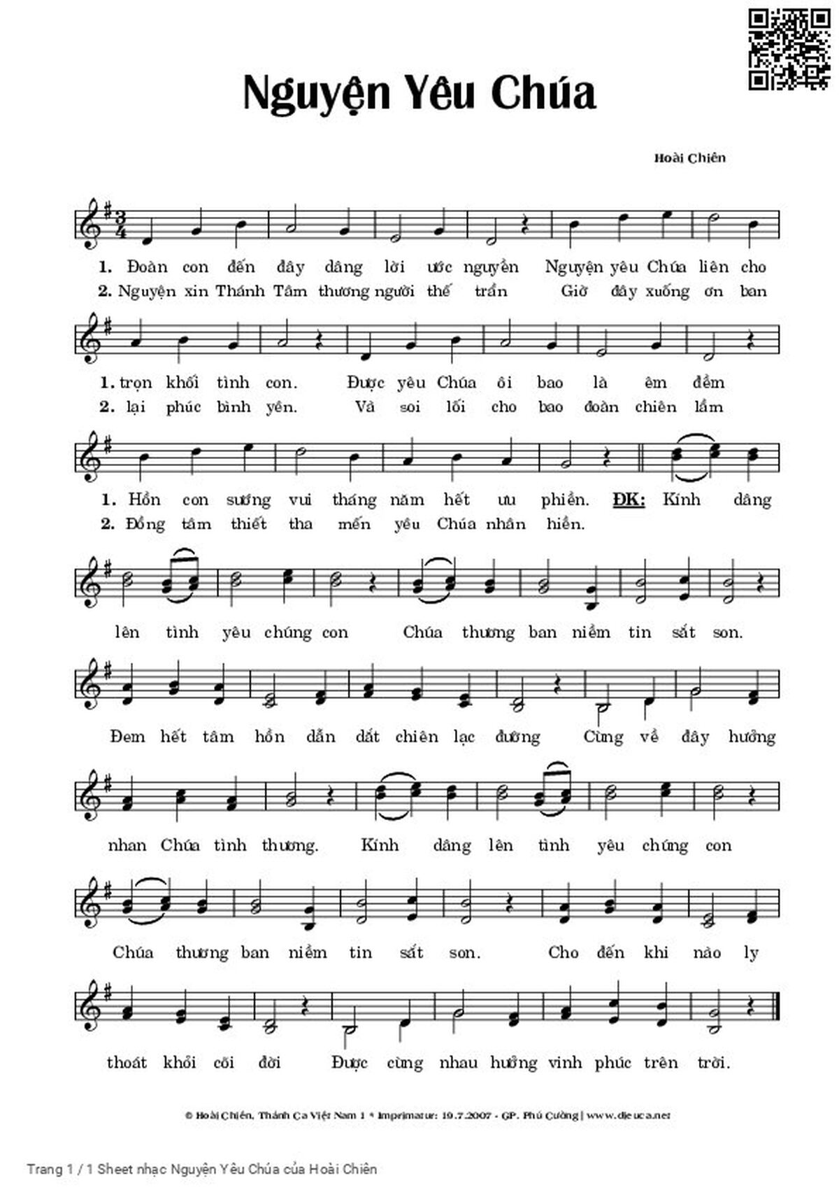 Phần nghe hát Nguyện Yêu Chúa (Hoài Chiên) được nhúng từ Youtube, Musescore hoặc link ngoài và chịu sự kiểm soát bản quyền của bên thứ ba đó, vì vậy có thể bị xóa hoặc chèn quảng cáo bất kỳ lúc nào. Nếu bạn không nghe - xem được ca sĩ hát tức là đã bị Youtube hoặc Musescore kiểm soát.