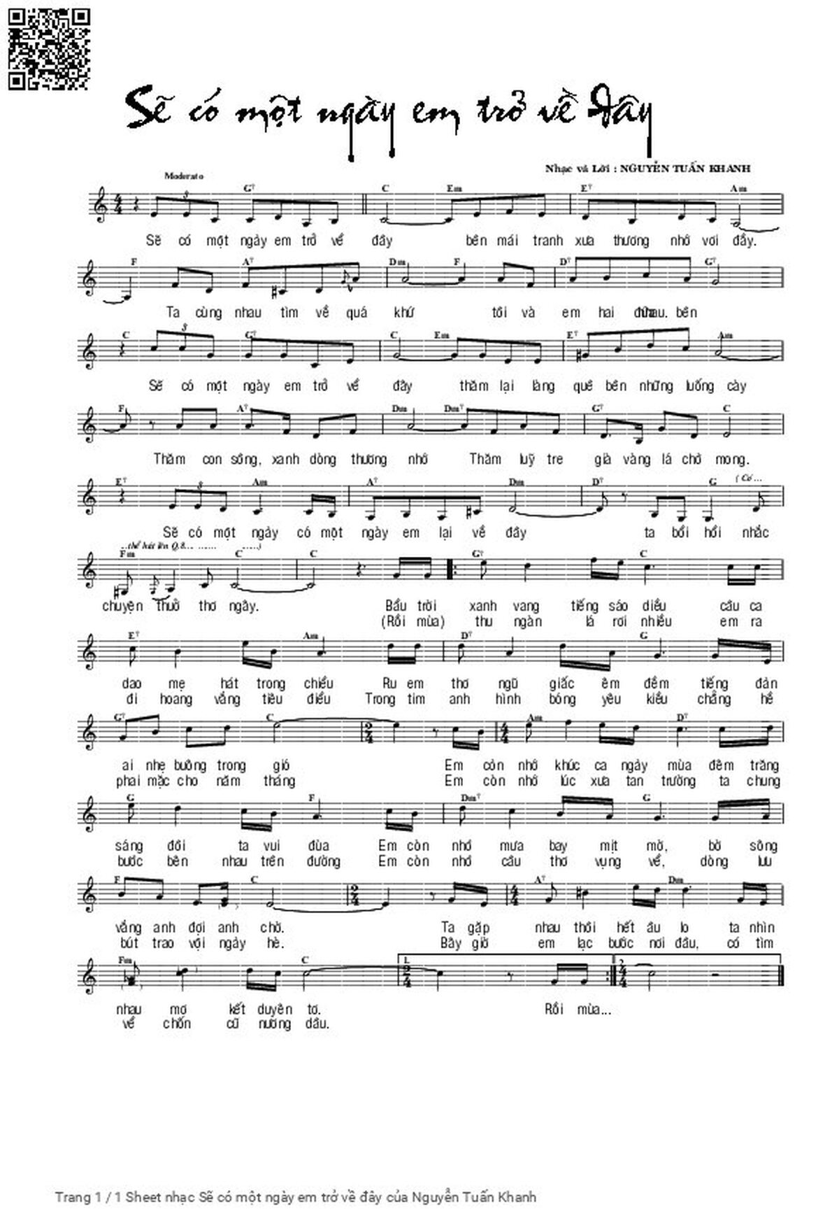 Nguyễn Tuấn Khanh Sẽ có một ngày em trở về đây Bên mái tranh xưa thương nhớ vơi đầy [PDF] [Sheet] [Lời H.A] [Mp4/Midi]