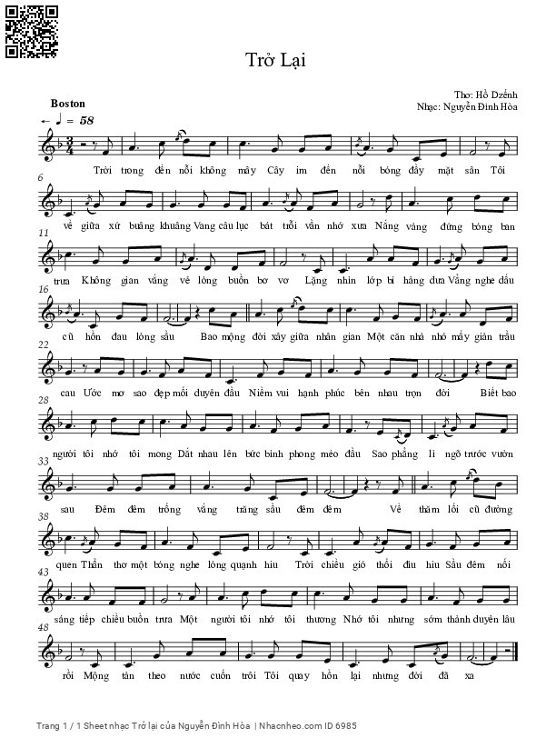 Phần nghe hát Trở lại (Nguyễn Đình Hòa) được nhúng từ Youtube, Musescore hoặc link ngoài và chịu sự kiểm soát bản quyền của bên thứ ba đó, vì vậy có thể bị xóa hoặc chèn quảng cáo bất kỳ lúc nào. Nếu bạn không nghe - xem được ca sĩ hát tức là đã bị Youtube hoặc Musescore kiểm soát.