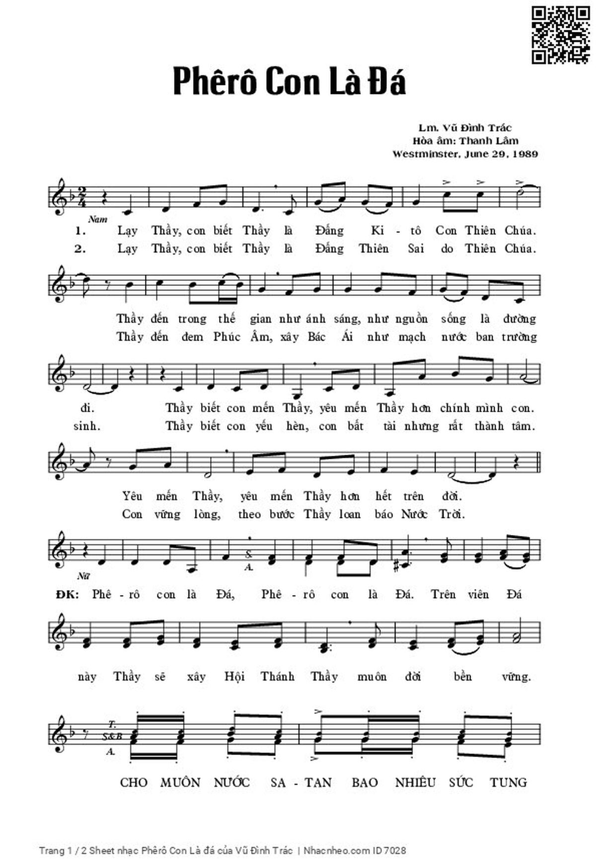 ĐK: Phê-rô con là Đá, Phê-rô con là Đá. Trên viên Đá này Thầy sẽ xây Hội Thánh Thầy muôn đời bền vững. Cho muôn nước Sa-tan bao nhiêu sức tung hoành, bao nhiêu sức vẫy vùng nhưng vẫn không hại được con. Thầy trao cho con chìa khóa Nước Trời. Con cầm buộc ai, giải thoát ai thì trên trời cũng cầm buộc và giải thoát theo ý con.