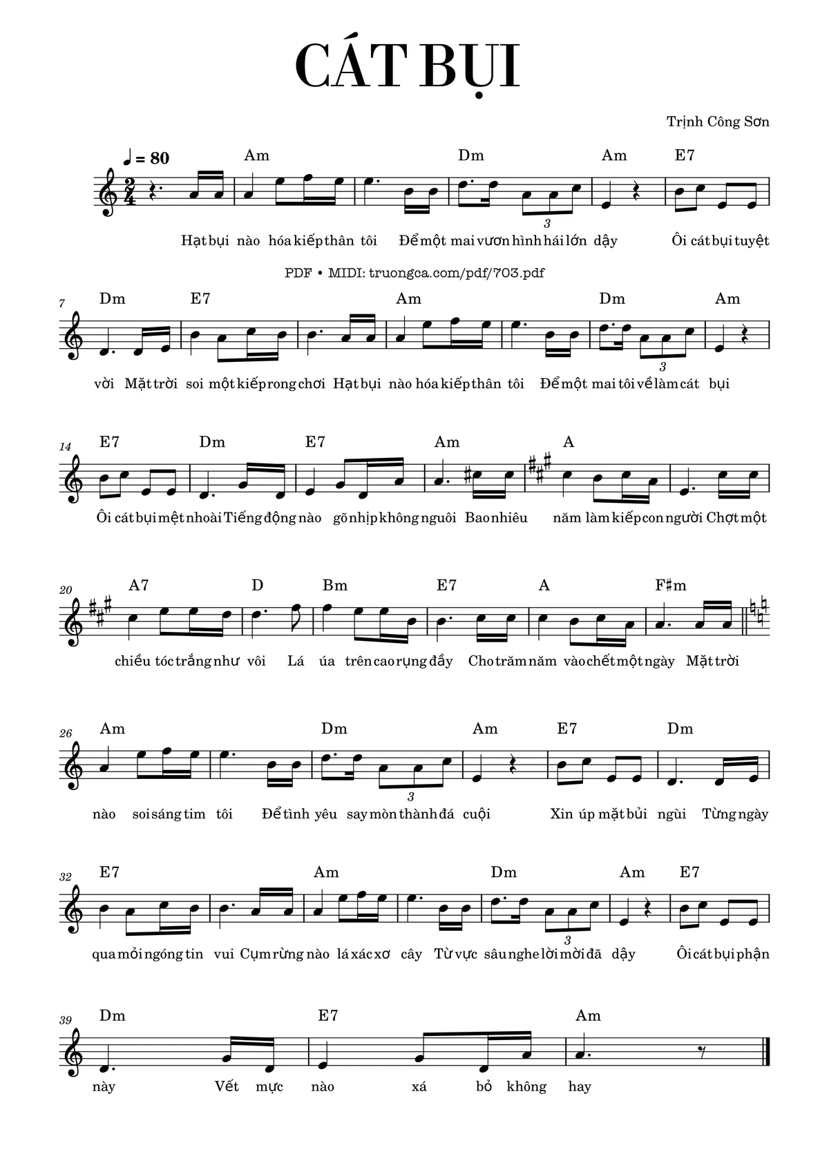 Chọn nút dấu + để tăng tông lên nửa cung, nút dấu - để giảm tông xuống nửa cung. Rê chuột vào hợp âm để xem các thế bấm hợp âm của bài hát Cát bụi.