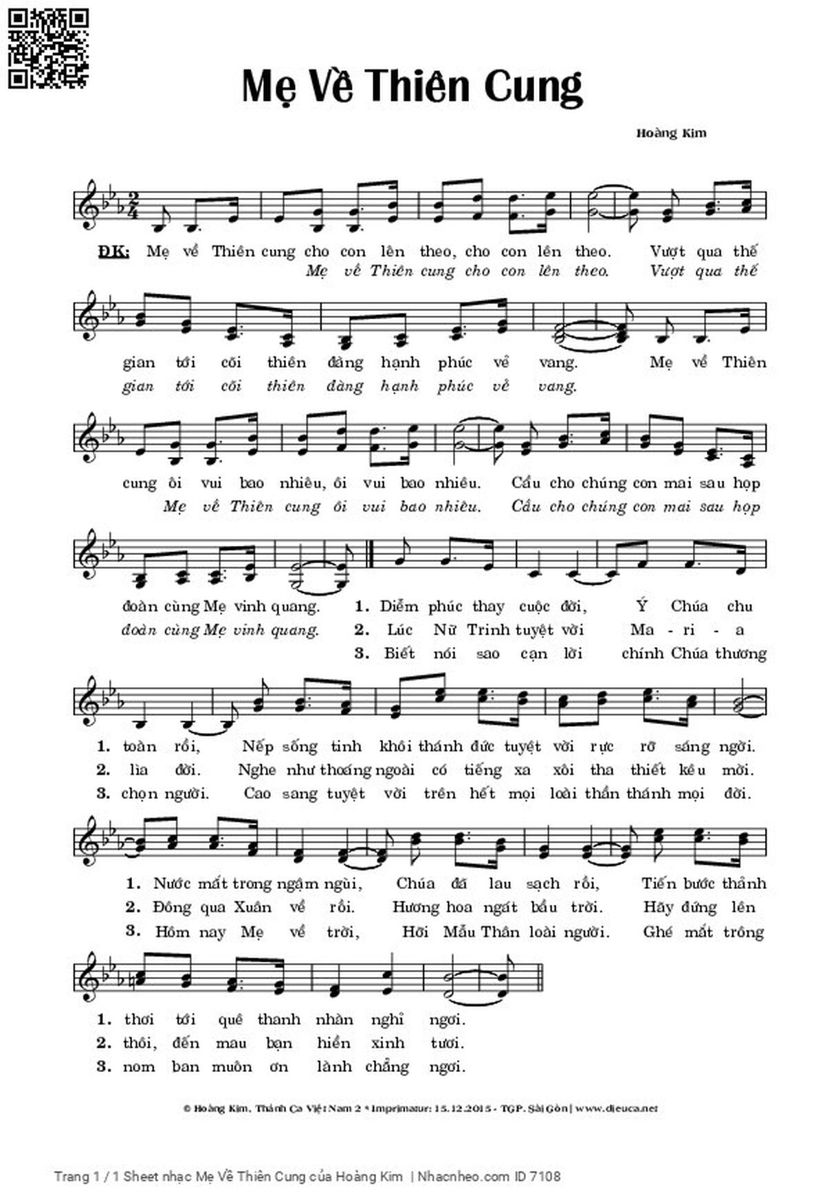ĐK: Mẹ về thiên cung cho con lên theo cho con lên theo. Vượt qua thế gian tới cõi thiên đàng hạnh phúc vẻ vang. Mẹ về thiên cung ôi vui bao nhiêu ôi vui bao nhiêu. Cầu cho chúng con mai sau họp đoàn cùng Mẹ vinh quang. 1. Diễm phúc thay cuộc đời ý Chúa chu toàn rồi. Nếp sống tinh khôi thánh đức tuyệt vời rực rỡ sáng ngời. Nước mắt trong ngậm ngùi Chúa đã lau sạch rồi. Tiến bước thảnh thơi tới quê thanh nhàn nghỉ ngơi.