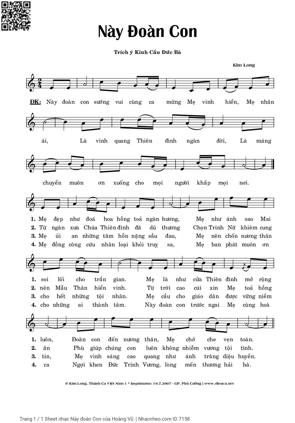 *ĐK: Này đoàn con sướng vui cùng ca mừng Mẹ vinh hiển, Mẹ nhân ái, Là vinh quang Thiên đình ngàn đời, Là máng chuyển muôn ơn xuống cho mọi người khắp mọi nơi.