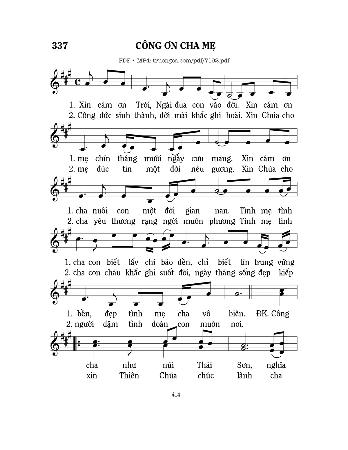 ĐK. Công cha như núi Thái Sơn, nghĩa mẹ như nước trong nguồn chảy ra. Một lòng thờ mẹ kính cha, cho tròn chữ hiếu mới là đạo con. Con xin Thiên Chúa chúc lành cha mẹ chung thủy chân thành vì con. Một đời duyên tình sắt son, gia đình hạnh phúc mãi còn mùa xuân. 2. Công đức sinh thành, đời mãi khắc ghi hoài. Xin Chúa cho mẹ đức tin một đời nêu gương. Xin Chúa cho cha yêu thương rạng ngời muôn phương. Tình mẹ tình cha con cháu khắc ghi suốt đời, ngày tháng sống đẹp kiếp người đậm tình đoàn con muôn nơi.