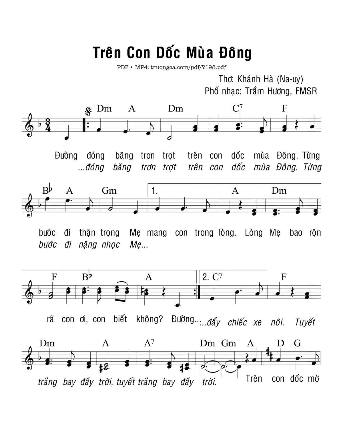 Đường đóng băng trơn trợt trên con dốc mùa Đông. Từng bước đi thận trọng Mẹ mang con trong lòng. Mẹ bao rộn rã con ơi, con biết không? Đường đóng băng trơn trợt trên con dốc mùa Đông. Từng bước đi nặng nhọc Mẹ đẩy chiếc xe nôi. Tuyết trắng bay đầy trời, tuyết trắng bay đầy trời.