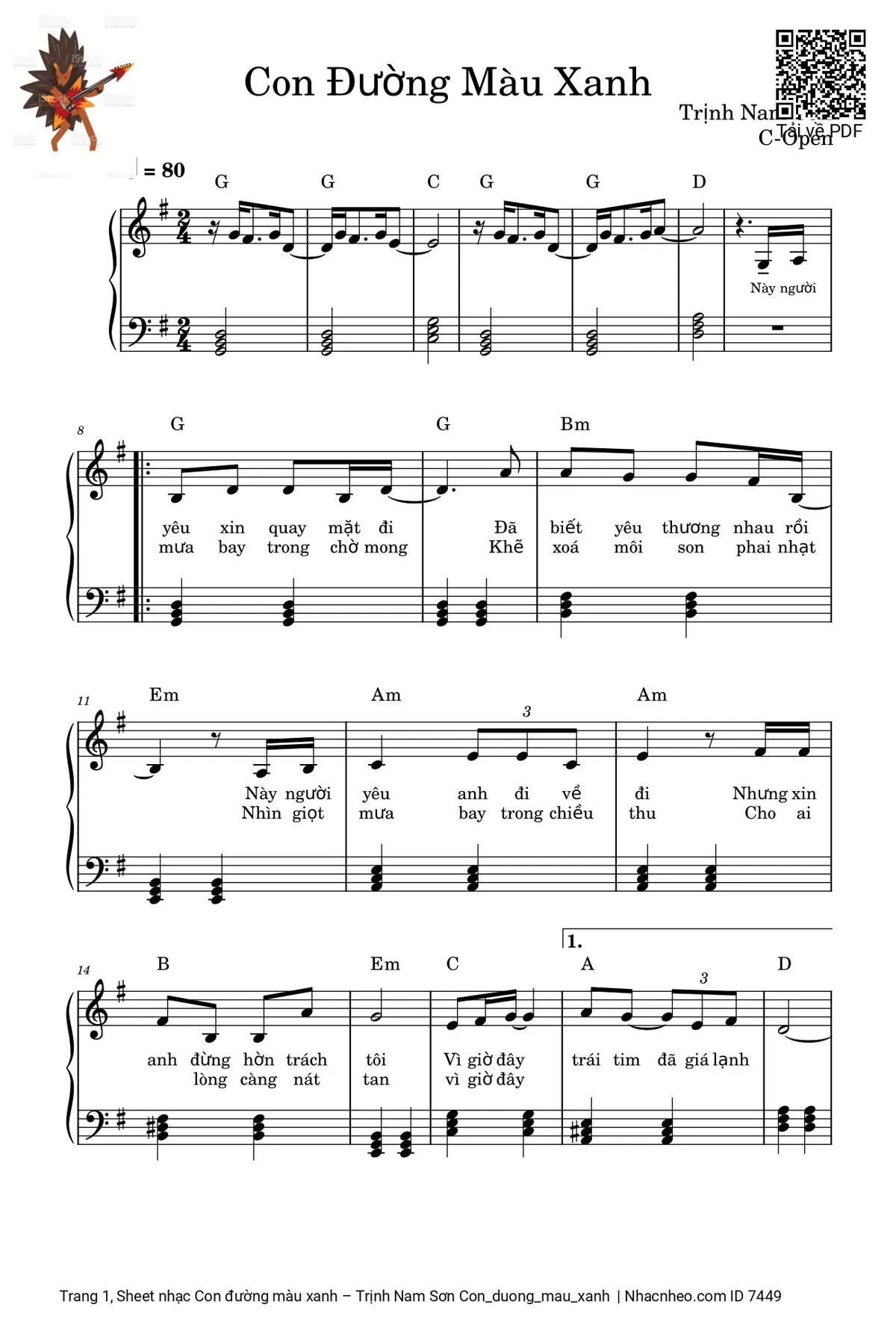 Chọn nút dấu + để tăng tông lên nửa cung, nút dấu - để giảm tông xuống nửa cung. Rê chuột vào hợp âm để xem các thế bấm hợp âm của bài hát Piano đơn giản Con đường màu xanh.