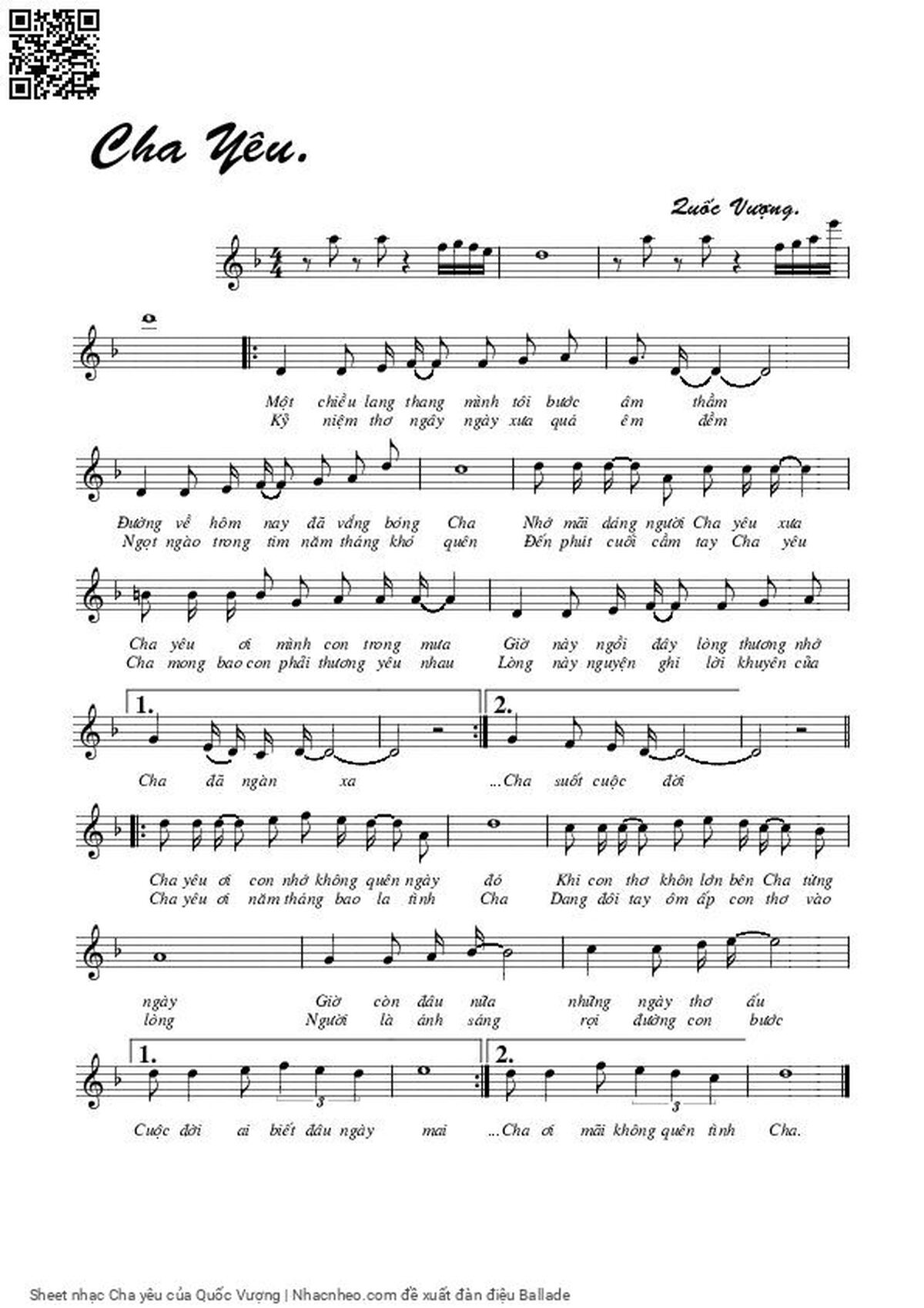 Phần nghe hát Cha yêu (Quốc Vượng) được nhúng từ Youtube, Musescore hoặc link ngoài và chịu sự kiểm soát bản quyền của bên thứ ba đó, vì vậy có thể bị xóa hoặc chèn quảng cáo bất kỳ lúc nào. Nếu bạn không nghe - xem được ca sĩ hát tức là đã bị Youtube hoặc Musescore kiểm soát.