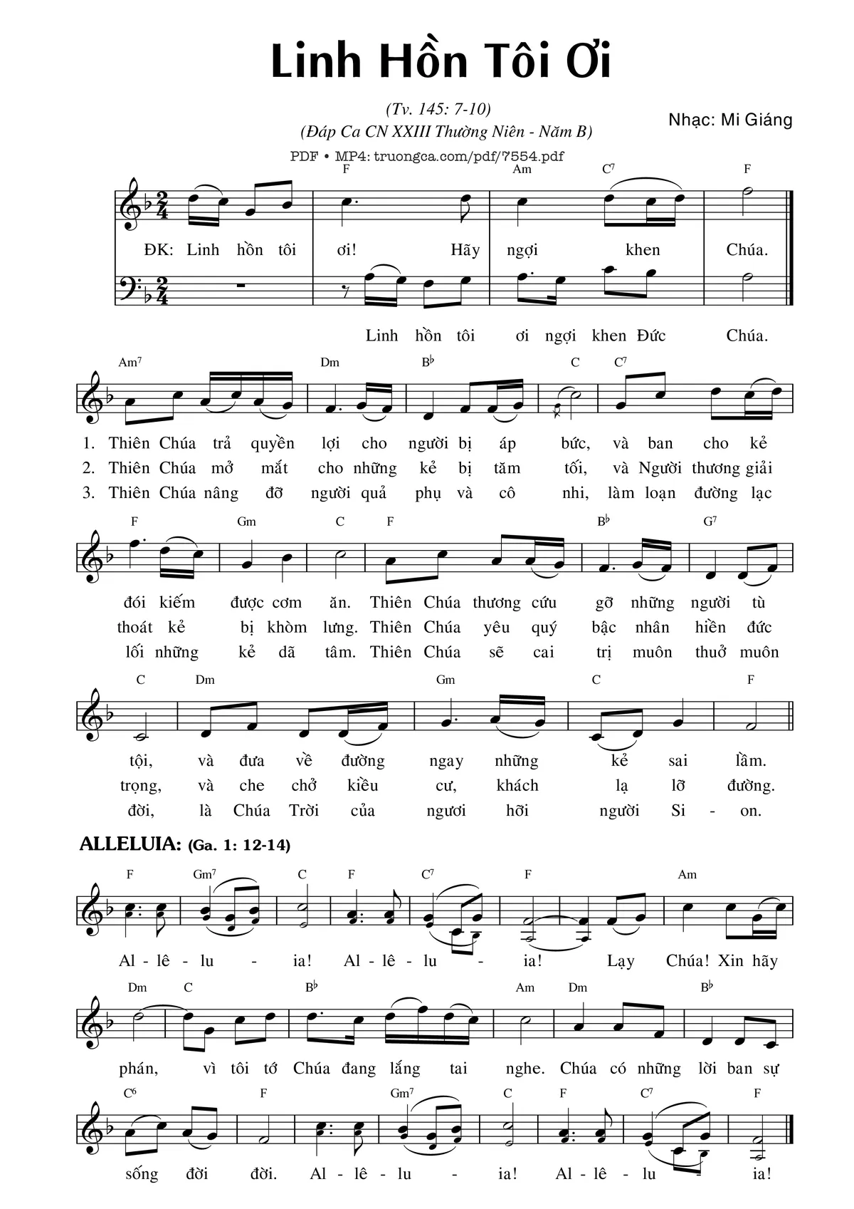 Câu đầu: Linh hồn tôi ơi Hãy ngợi khen Chúa Thiên Chúa trả quyền lợi cho người bị áp bức