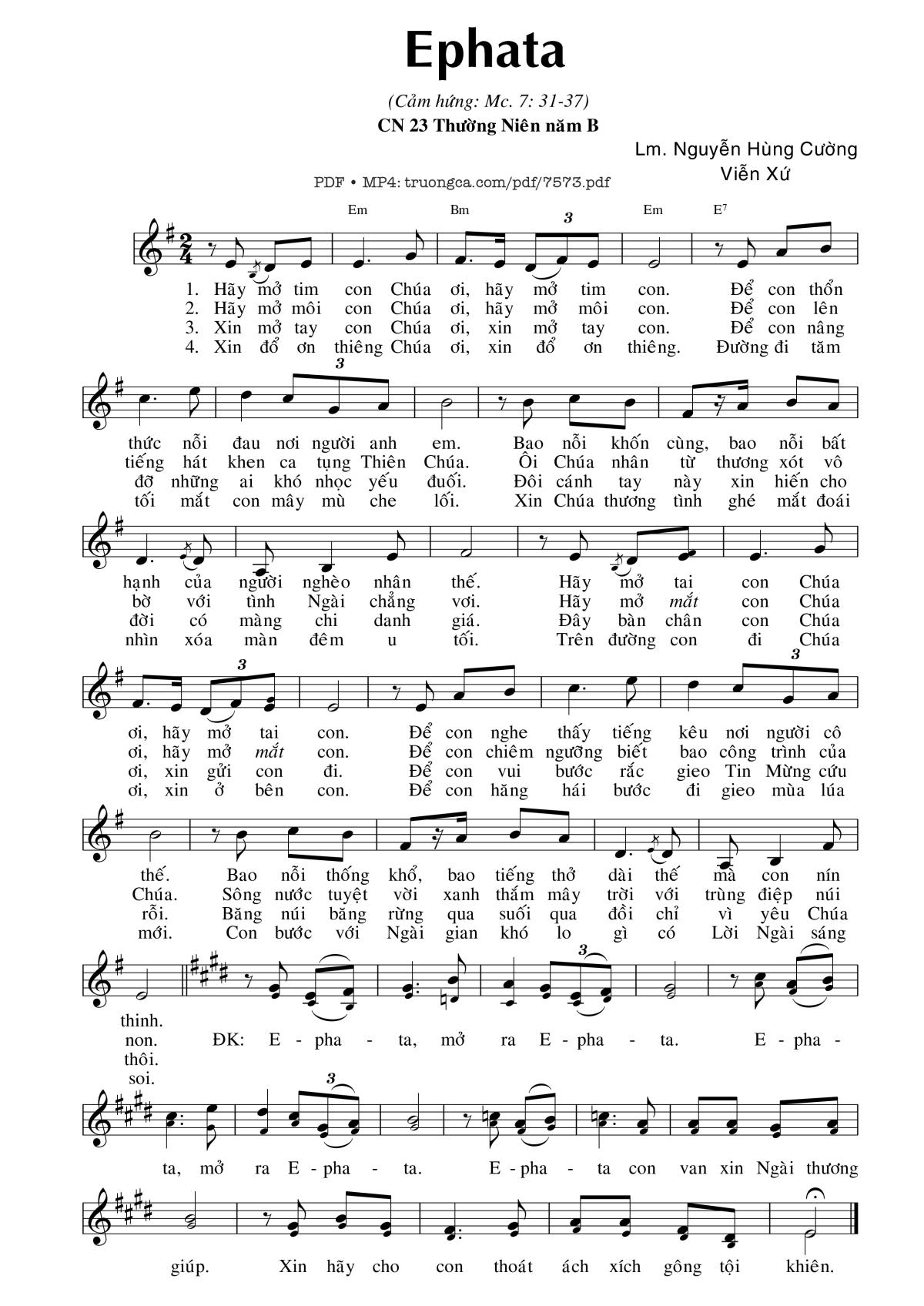 Chọn nút dấu + để tăng tông lên nửa cung, nút dấu - để giảm tông xuống nửa cung. Rê chuột vào hợp âm để xem các thế bấm hợp âm của bài hát Ephata (mc. 7).