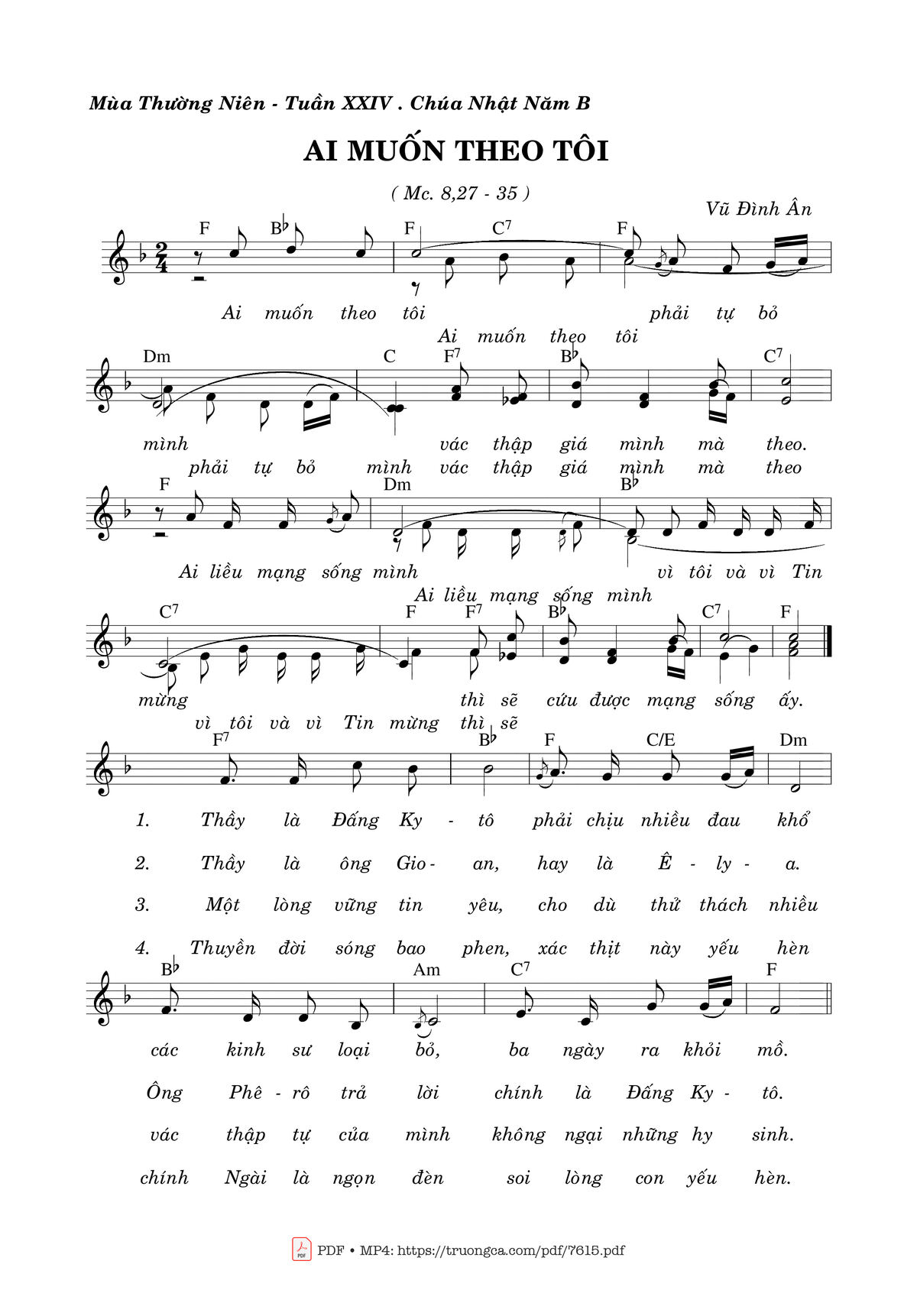 ĐK. Ai muốn theo tôi phải tự bỏ mình vác thập giá mình mà theo. Ai liều mạng sống mình vì Tin Mừng thì sẽ cứu được mạng sống ấy.