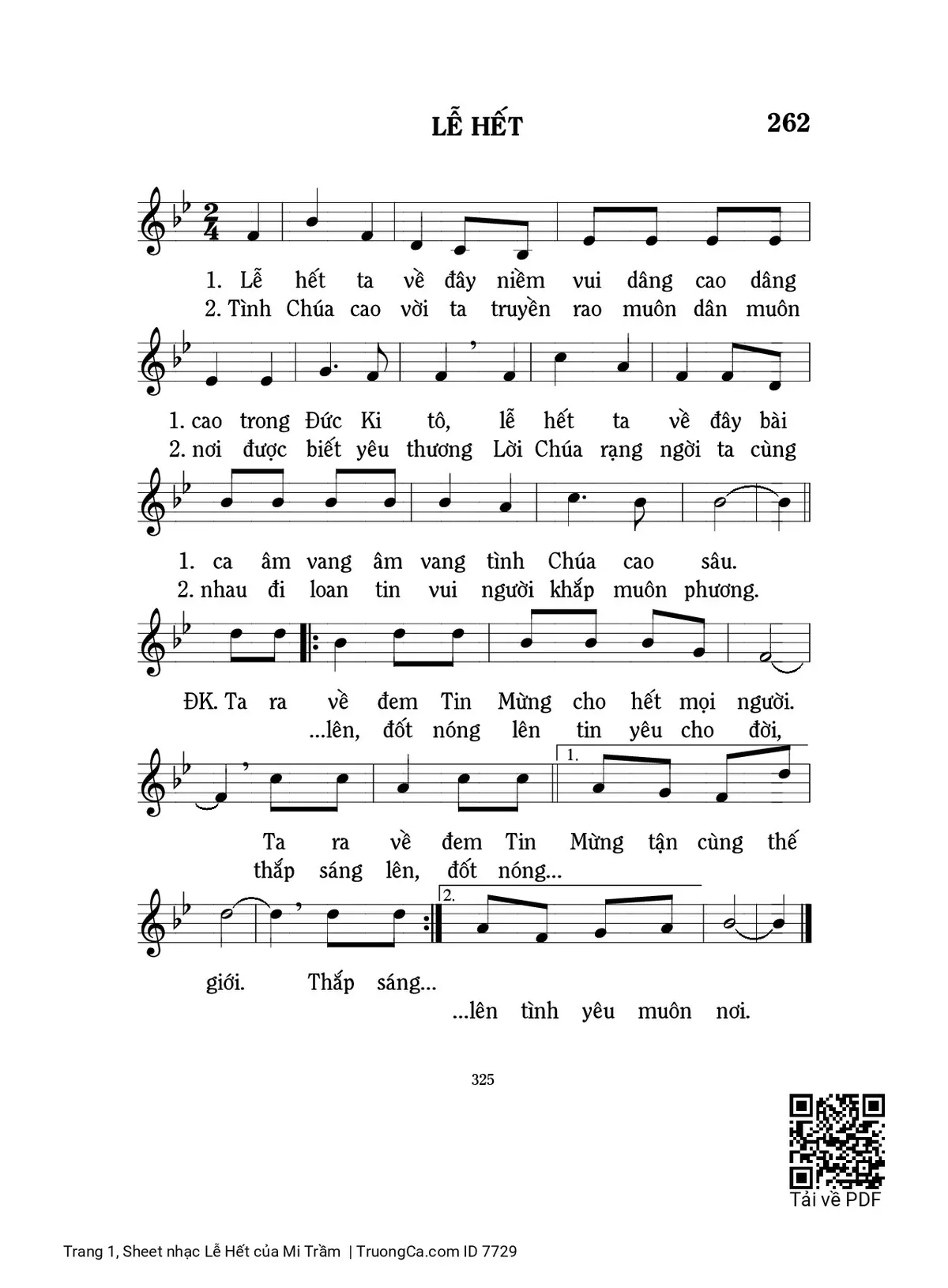 Ðk. Ta ra về đem Tin Mừng cho hết mọi người. Ta ra về đem Tin Mừng tận cùng thế giới. Thắp sáng lên, đốt nóng lên tin yêu cho đời. Thắp sáng lên, đốt nóng lên tình yêu muôn nơi.