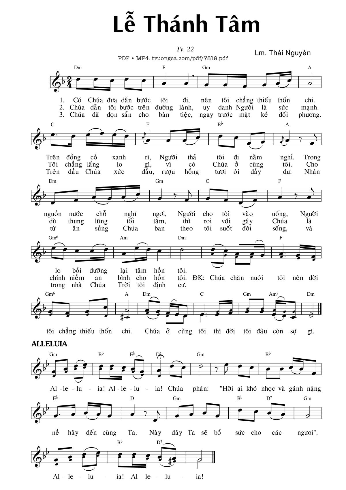 1. Có Chúa đưa dẫn bước tôi đi, nên tôi chẳng thiếu thốn chi. Trên đồng cỏ xanh rì, Ngài thả tôi đi nằm nghỉ. Trong nguồn nước chỗ nghỉ ngơi, Ngài cho tôi vào uống, Ngài lo bồi dưỡng lại tâm hồn tôi.