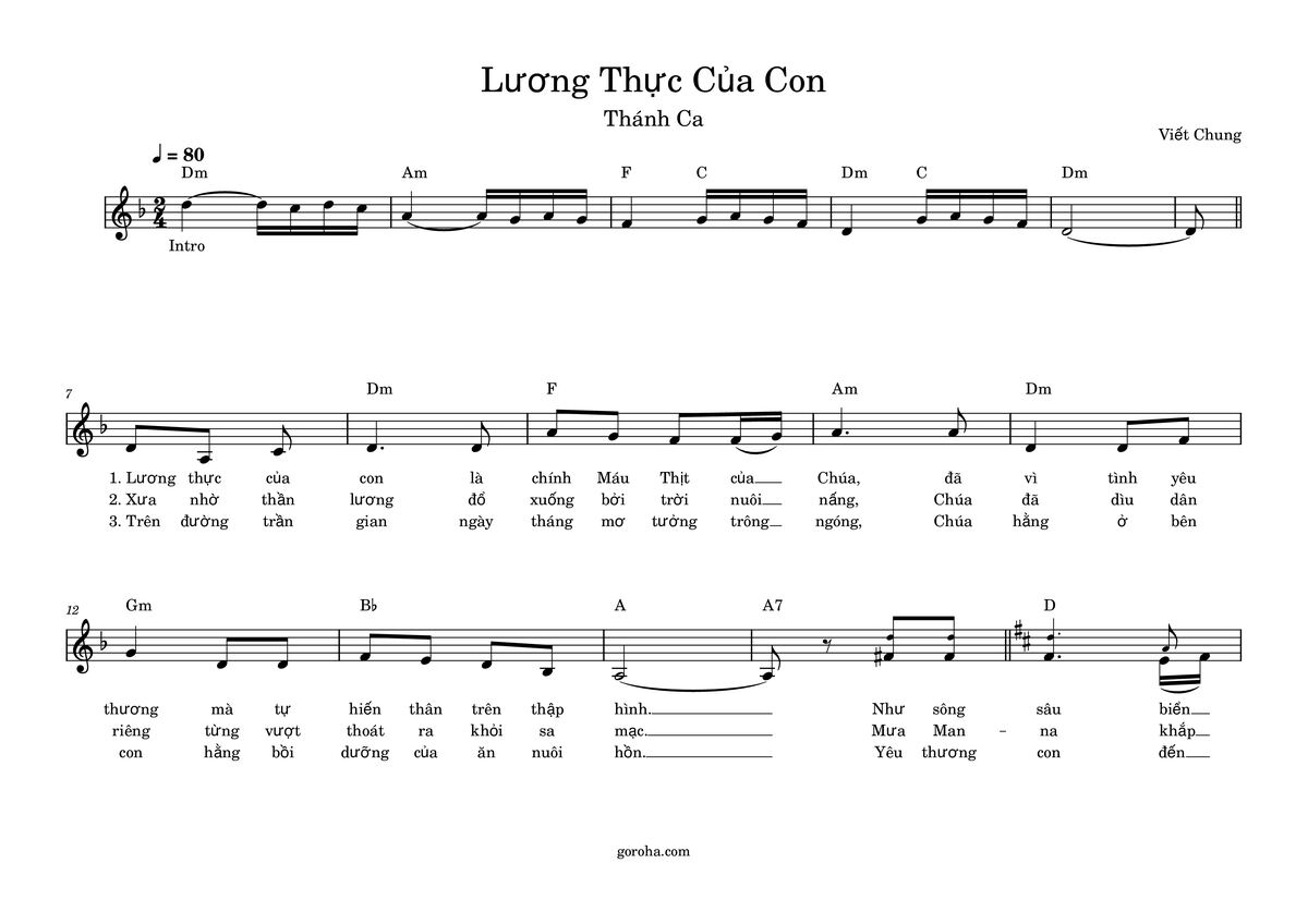 1) Lương thực của con là chính Máu Thịt của Chúa đã vì tình yêu thương mà tự hiến thân trên thập hình. Như sônsâu biển rộng như non cao núi thẳm, lương thực tình yêu nuôi dưỡng tâm linh. Bao ân sâu nghĩa nặng, ôi cao siêu thánh thiện muôn đời lòng con đâu dám vong tình.