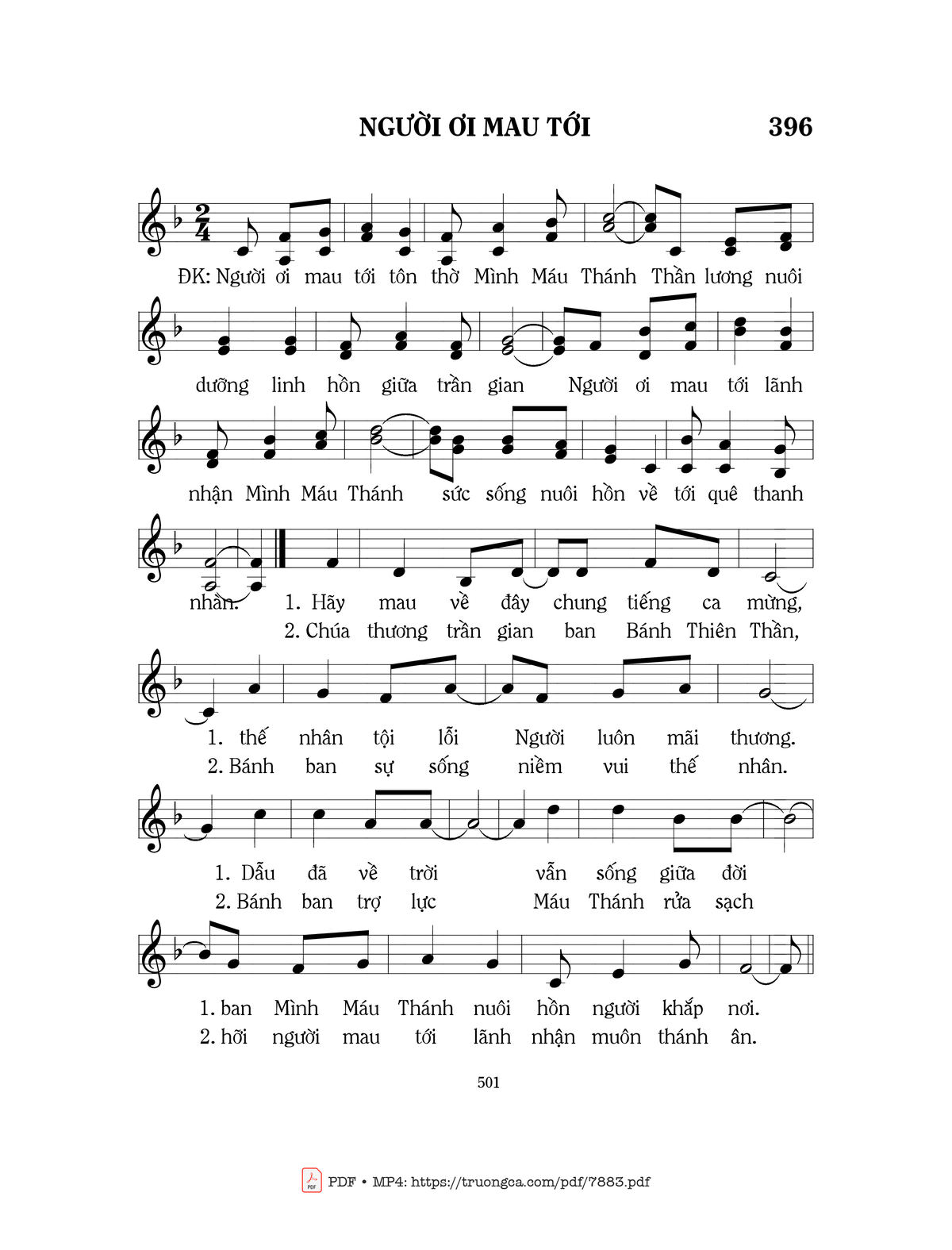 ĐK: Người ơi mau tới tôn thờ Mình Máu Thánh Thần lương nuôi dưỡng linh hồn giữa trần gian. Người ơi mau tới lãnh nhận Mình Máu Thánh sức sống nuôi hồn về tới quê thanh nhàn.