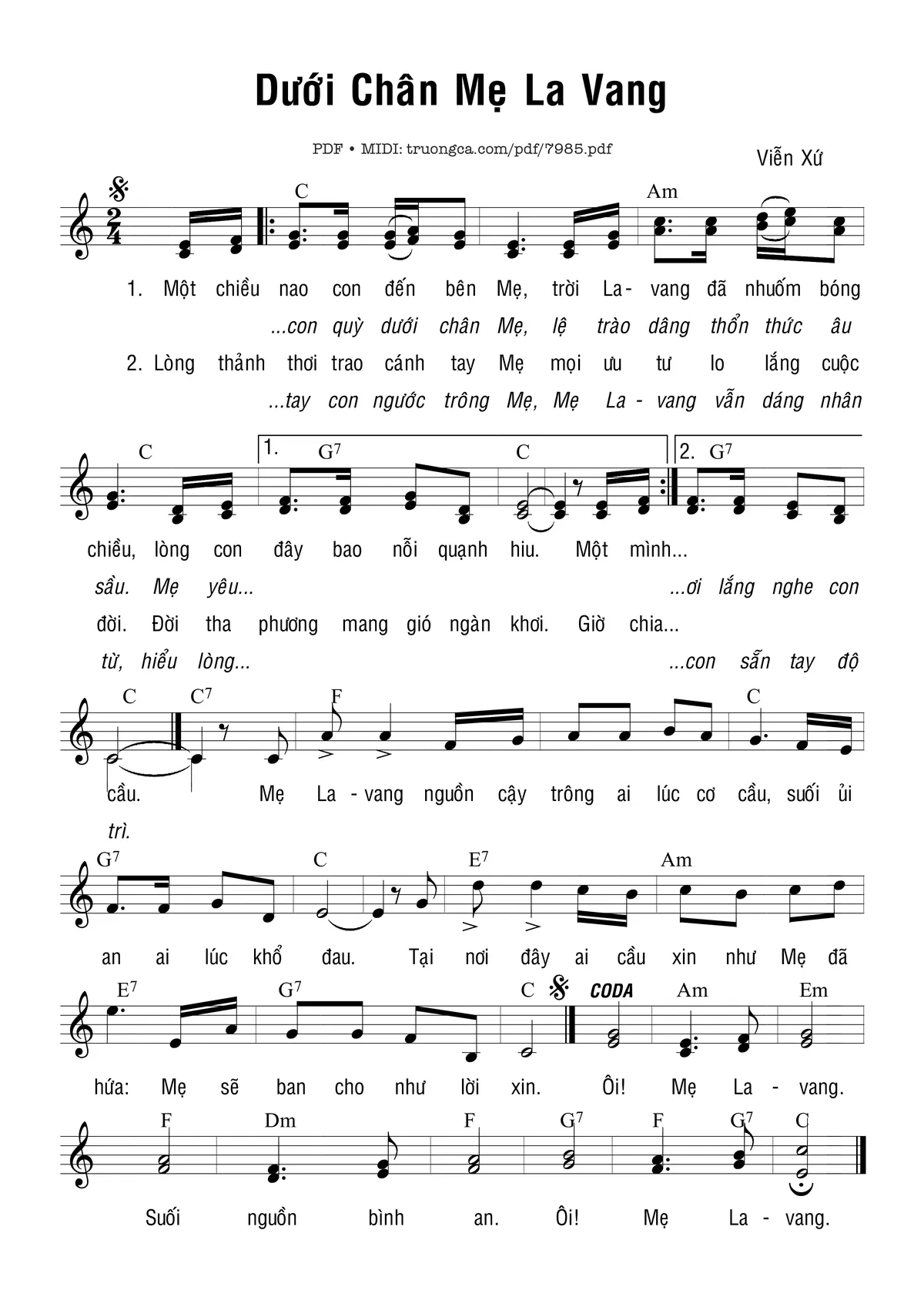 Phần nghe hát Dưới Chân Mẹ La Vang (Viễn Xứ) được nhúng từ Youtube, Musescore hoặc link ngoài và chịu sự kiểm soát bản quyền của bên thứ ba đó, vì vậy có thể bị xóa hoặc chèn quảng cáo bất kỳ lúc nào. Nếu bạn không nghe - xem được ca sĩ hát tức là đã bị Youtube hoặc Musescore kiểm soát.