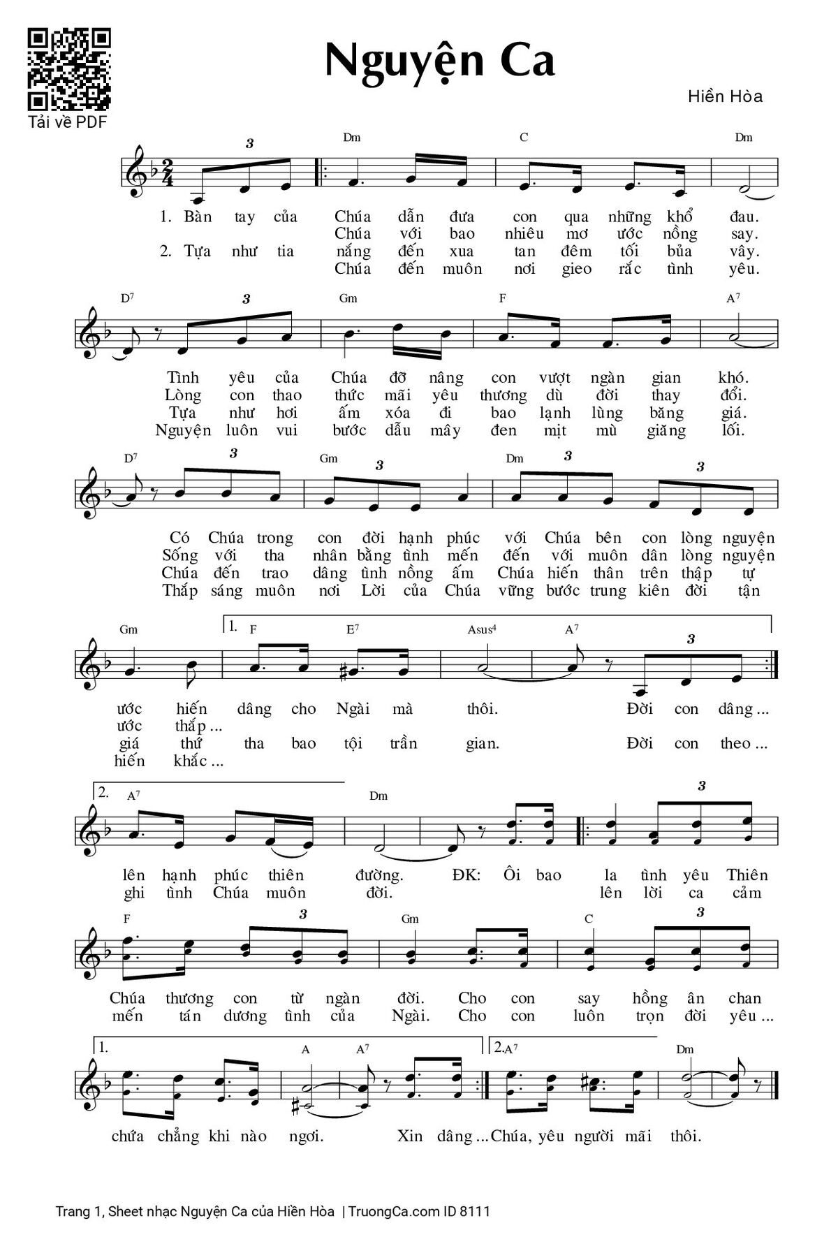Phần nghe hát Nguyện Ca (Hiền Hòa) được nhúng từ Youtube, Musescore hoặc link ngoài và chịu sự kiểm soát bản quyền của bên thứ ba đó, vì vậy có thể bị xóa hoặc chèn quảng cáo bất kỳ lúc nào. Nếu bạn không nghe - xem được ca sĩ hát tức là đã bị Youtube hoặc Musescore kiểm soát.