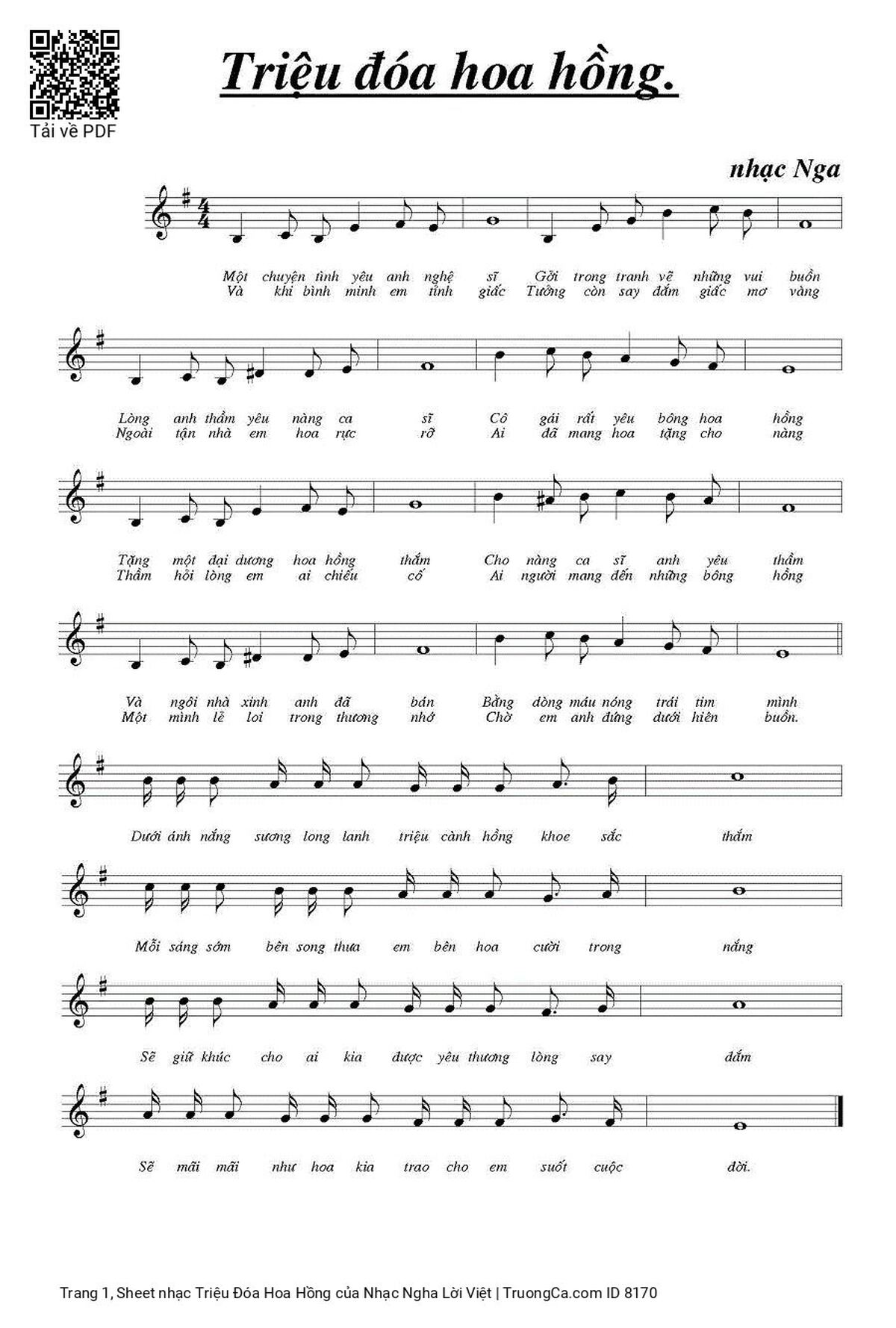 Sheet nhạc có nốt Triệu Đóa Hoa Hồng của nhạc sĩ Nhạc Ngha Lời Việt và file PDF nốt nhạc đăng lên đây nhằm giúp các bạn xướng âm cho đúng nốt và hát thêm hay, chỉ mang tính chất tham khảo, không có mục đích thương mại. Bản quyền thuộc về tác giả và tổ chức nắm bản quyền, Truongca.com không giữ bất kỳ bản quyền của nội dung nào cả. Các bạn có thể tải về bản PDF chất lượng cao, gồm khuông nhạc có nốt với đường link file PDF bên trên.