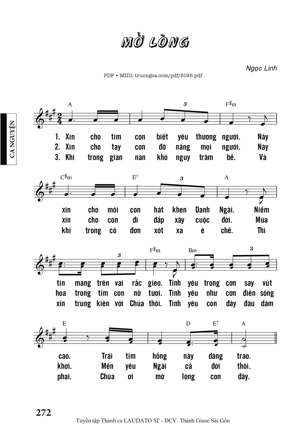Chọn nút dấu + để tăng tông lên nửa cung, nút dấu - để giảm tông xuống nửa cung. Rê chuột vào hợp âm để xem các thế bấm hợp âm của bài hát Mở Lòng.