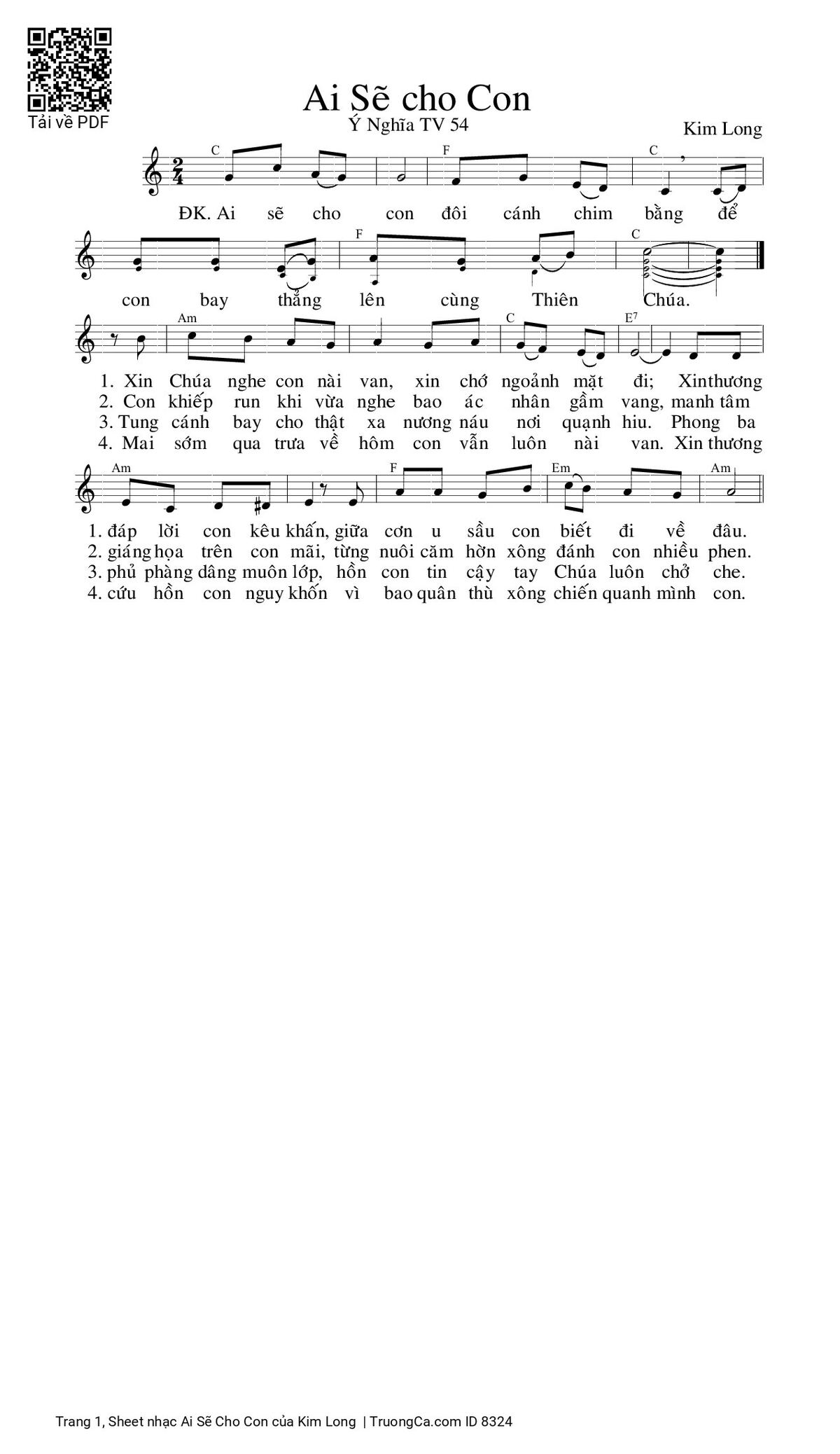 Kim Long ÐK Ai sẽ cho con đôi cánh chim bằng để con bay thẳng lên cùng Thiên Chúa [PDF] [Sheet] [Lời H.A] [Mp4/Midi]