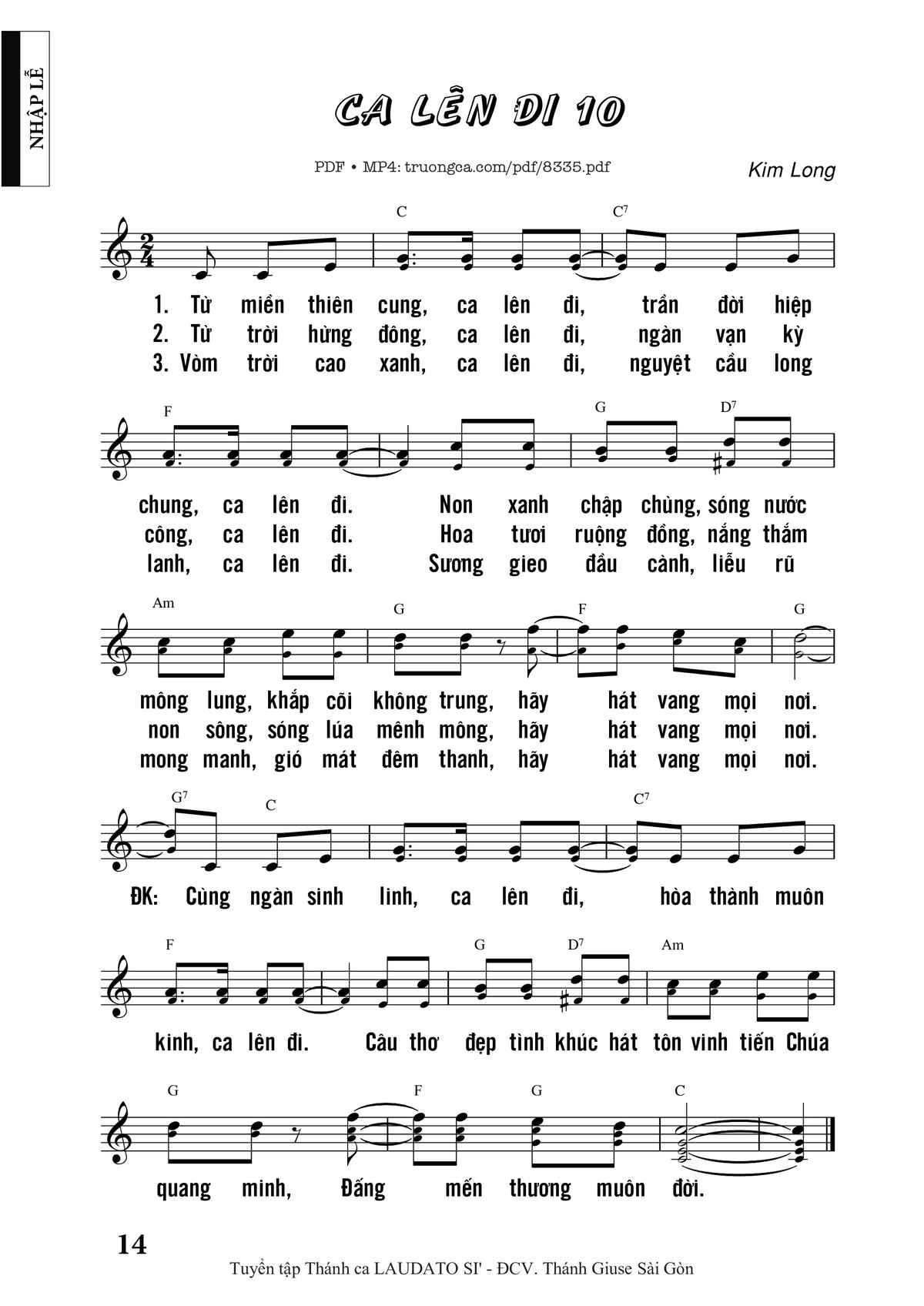 Điệp khúc. Cùng ngàn sinh linh ca lên đi, hòa thành muôn kinh ca lên đi. Câu thơ đẹp tình khúc hát tôn vinh tiến Chúa quang minh, Đấng mến thương muôn đời.