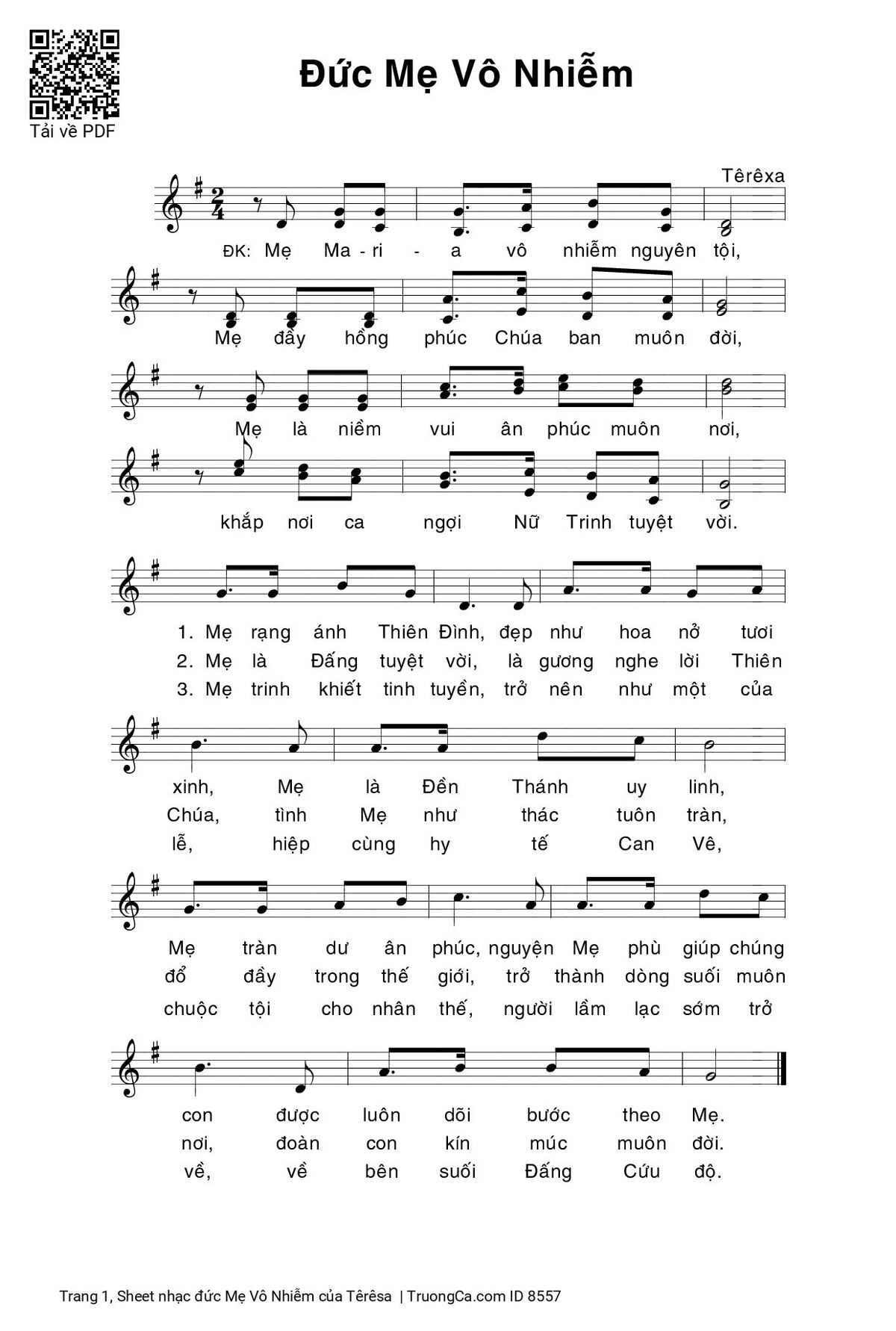 Têrêsa Mẹ Maria vô nhiễm nguyên tội Mẹ đầy hồng phúc Chúa ban muôn đời [PDF] [Sheet] [Lời H.A] [Mp4/Midi]