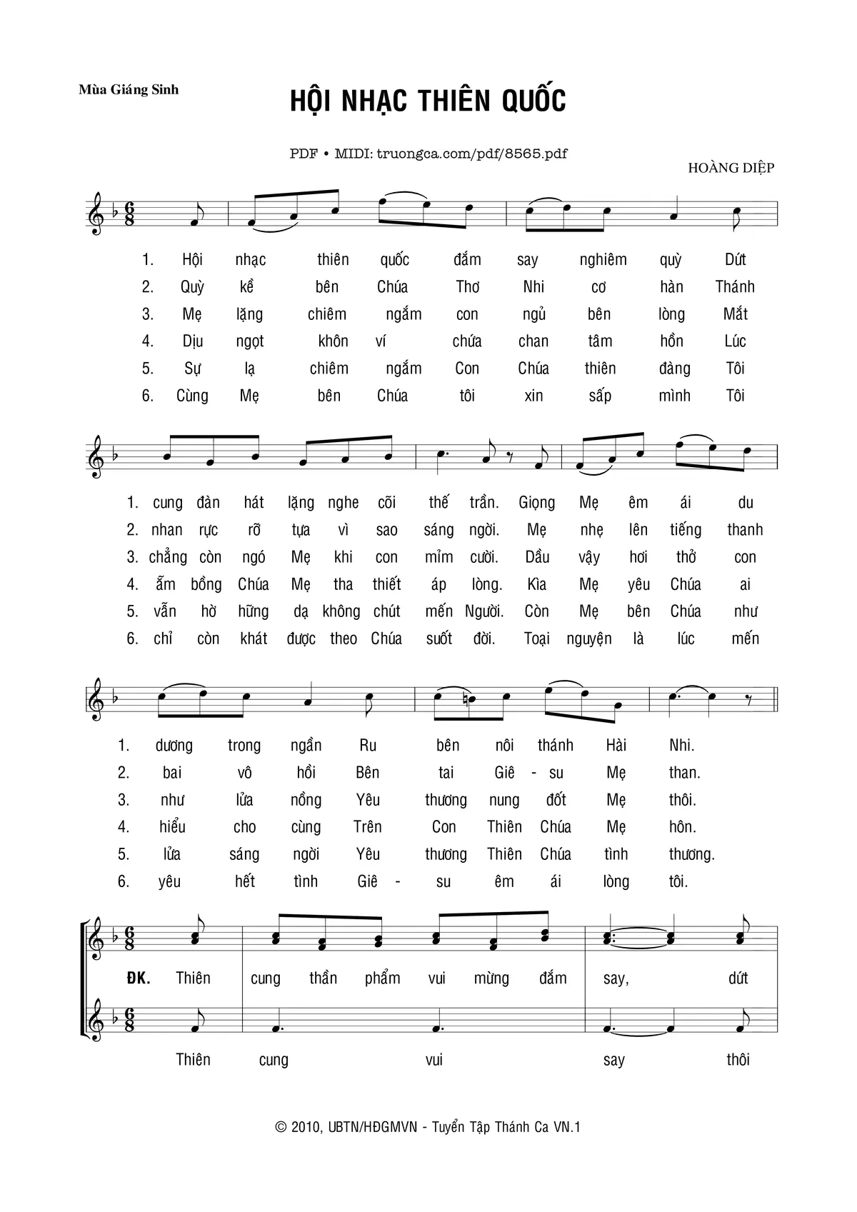 Phần nghe hát Hội Nhạc Thiên Quốc (Lời Việt: Hoàng Diệp) được nhúng từ Youtube, Musescore hoặc link ngoài và chịu sự kiểm soát bản quyền của bên thứ ba đó, vì vậy có thể bị xóa hoặc chèn quảng cáo bất kỳ lúc nào. Nếu bạn không nghe - xem được ca sĩ hát tức là đã bị Youtube hoặc Musescore kiểm soát.