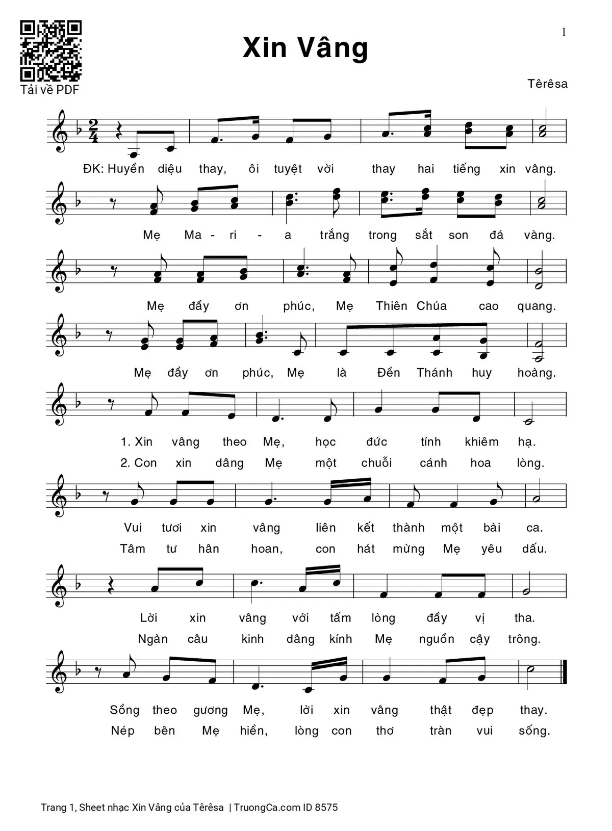 Têrêsa Huyền diệu thay ôi tuyệt vời thay hai tiếng xin vâng [PDF] [Sheet] [Lời H.A] [Mp4/Midi]