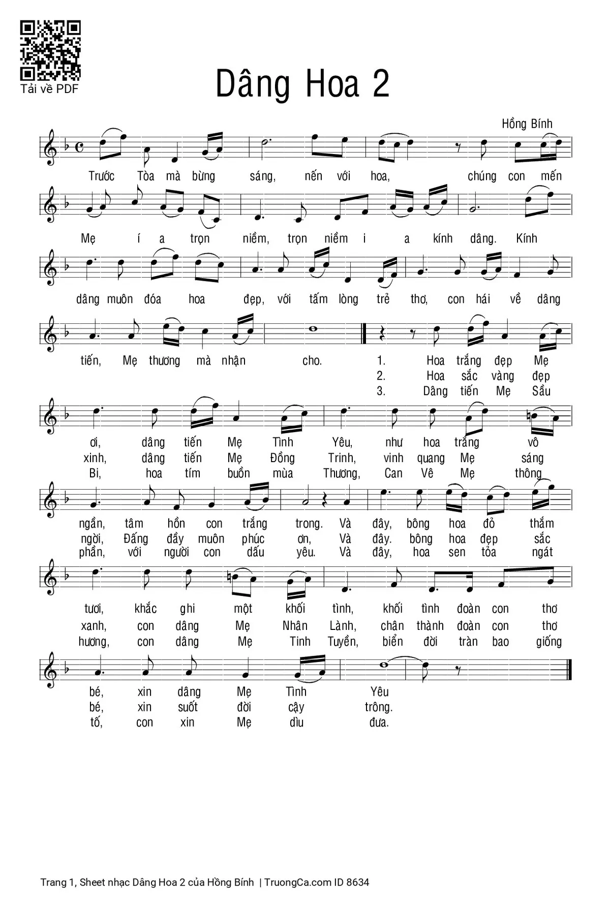 ĐK. Trước Tòa (mà) bừng sáng, nến với hoa, chúng con mến Mẹ (í a) trọn niềm, trọn niềm (í a) kính dâng. Kính dâng muôn đóa hoa đẹp, với tấm lòng trẻ thơ, con hái về dâng tiến, Mẹ thương mà nhận cho.