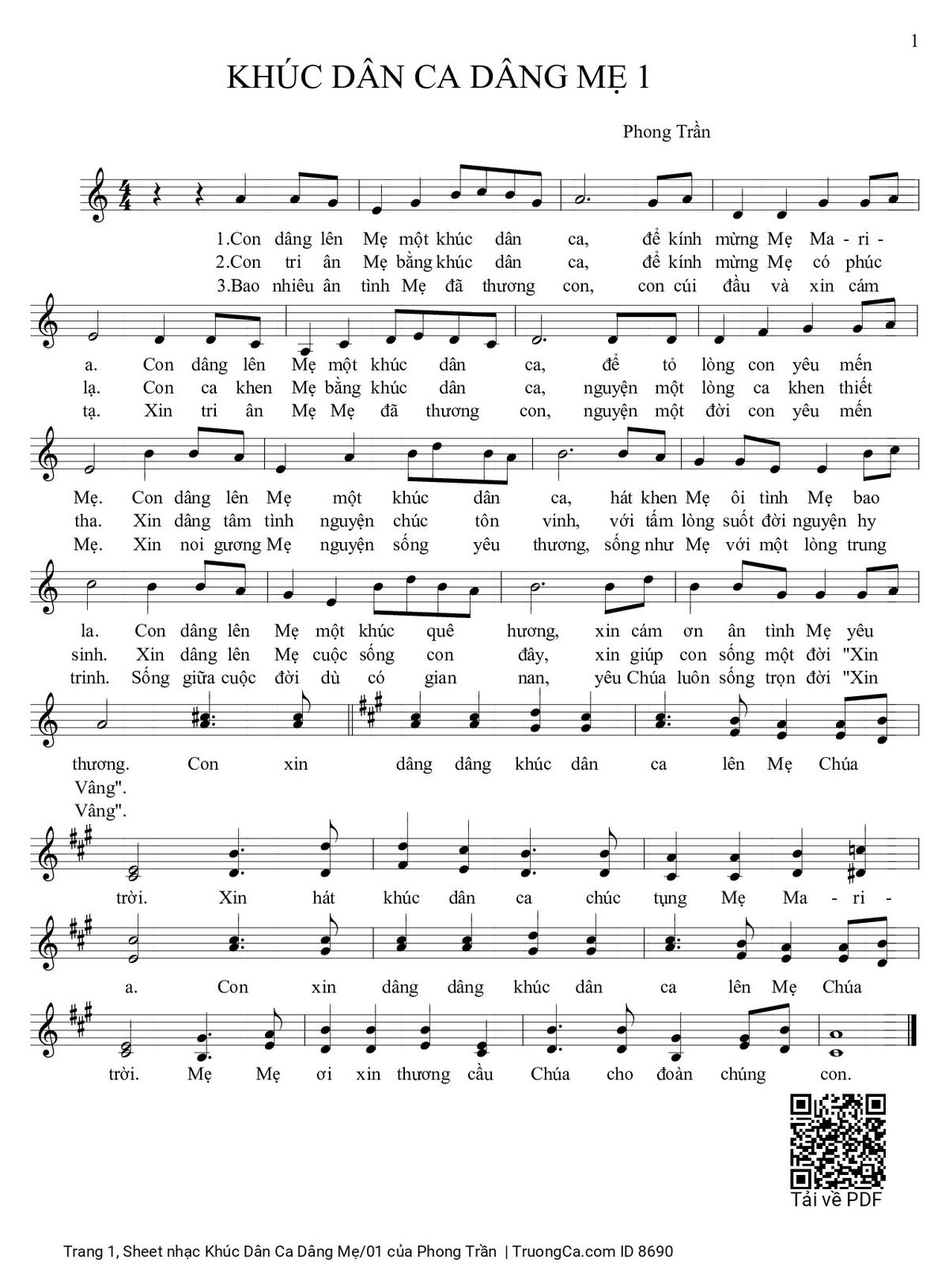 Phong Trần Con dâng lên Mẹ một khúc dân ca để kính mừng Mẹ Maria [PDF] [Sheet] [Lời H.A] [Mp4/Midi]