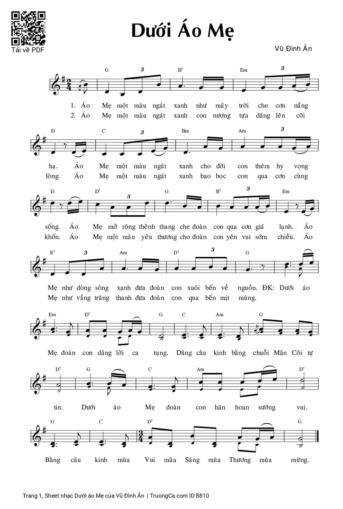 1. Áo Mẹ một màu ngát xanh như mây trời che cơn nắng hạ, áo Mẹ một màu ngát xanh cho đời con thêm hy vọng sống, áo Mẹ mở rộng thênh thang che đoàn con qua cơn giá lạnh, áo Mẹ như dòng sông xanh đưa đoàn con xuôi bến về nguồn.