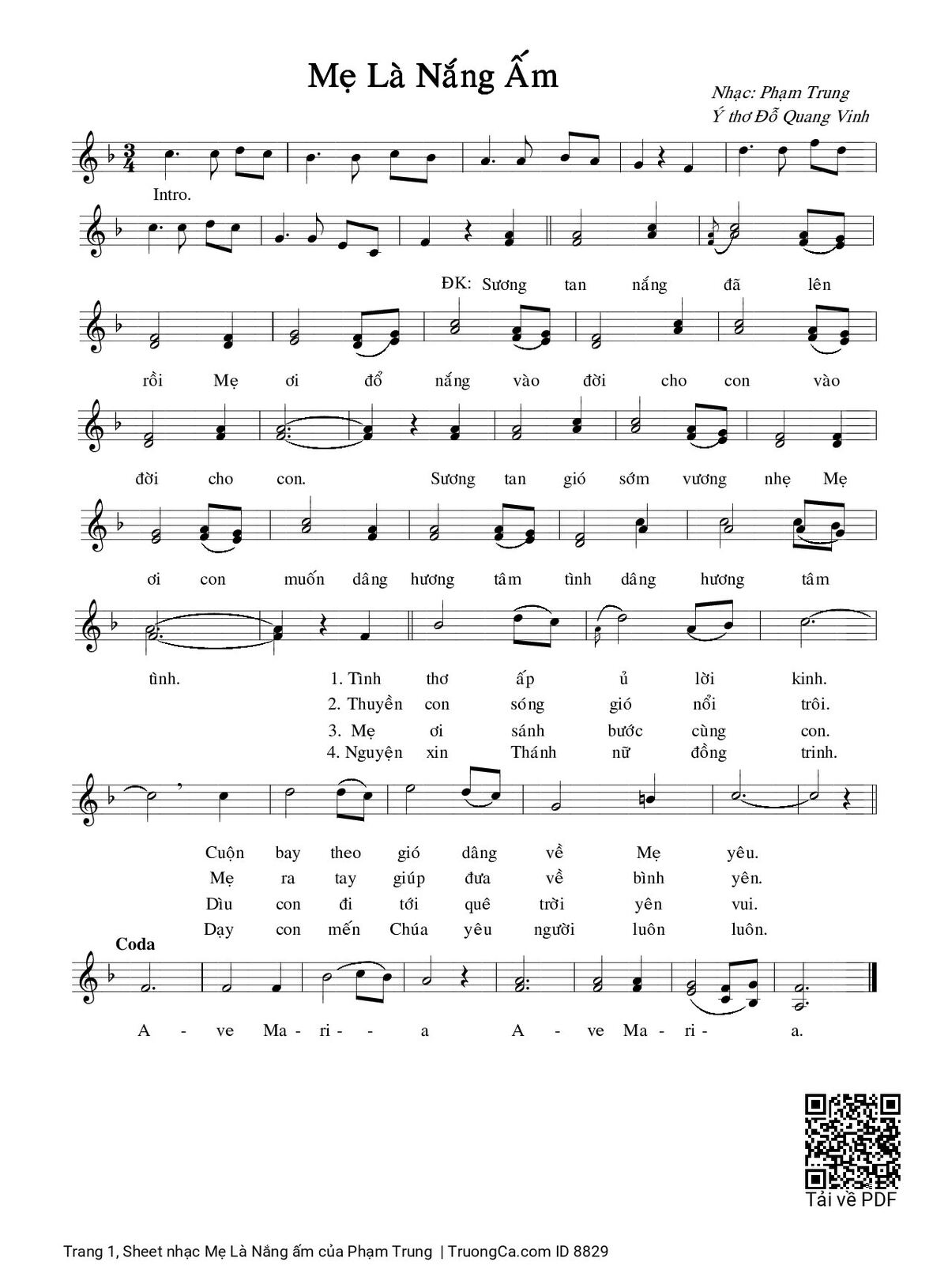 1/ Tình thơ ấp ủ lời kinh. Cuộn bay theo gió dâng về Mẹ yêu. A-ve Ma-ri-a. A-ve Ma-ri-a.